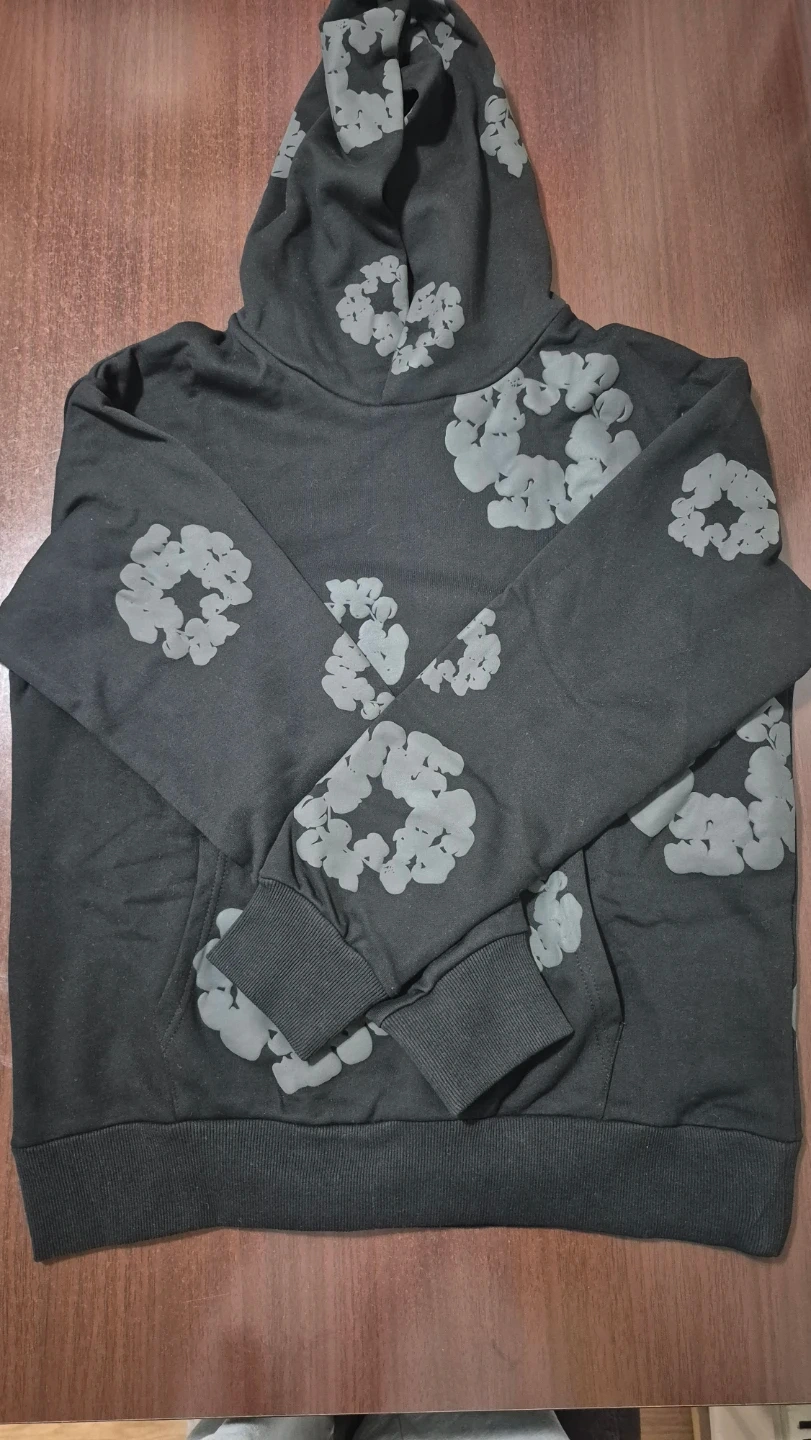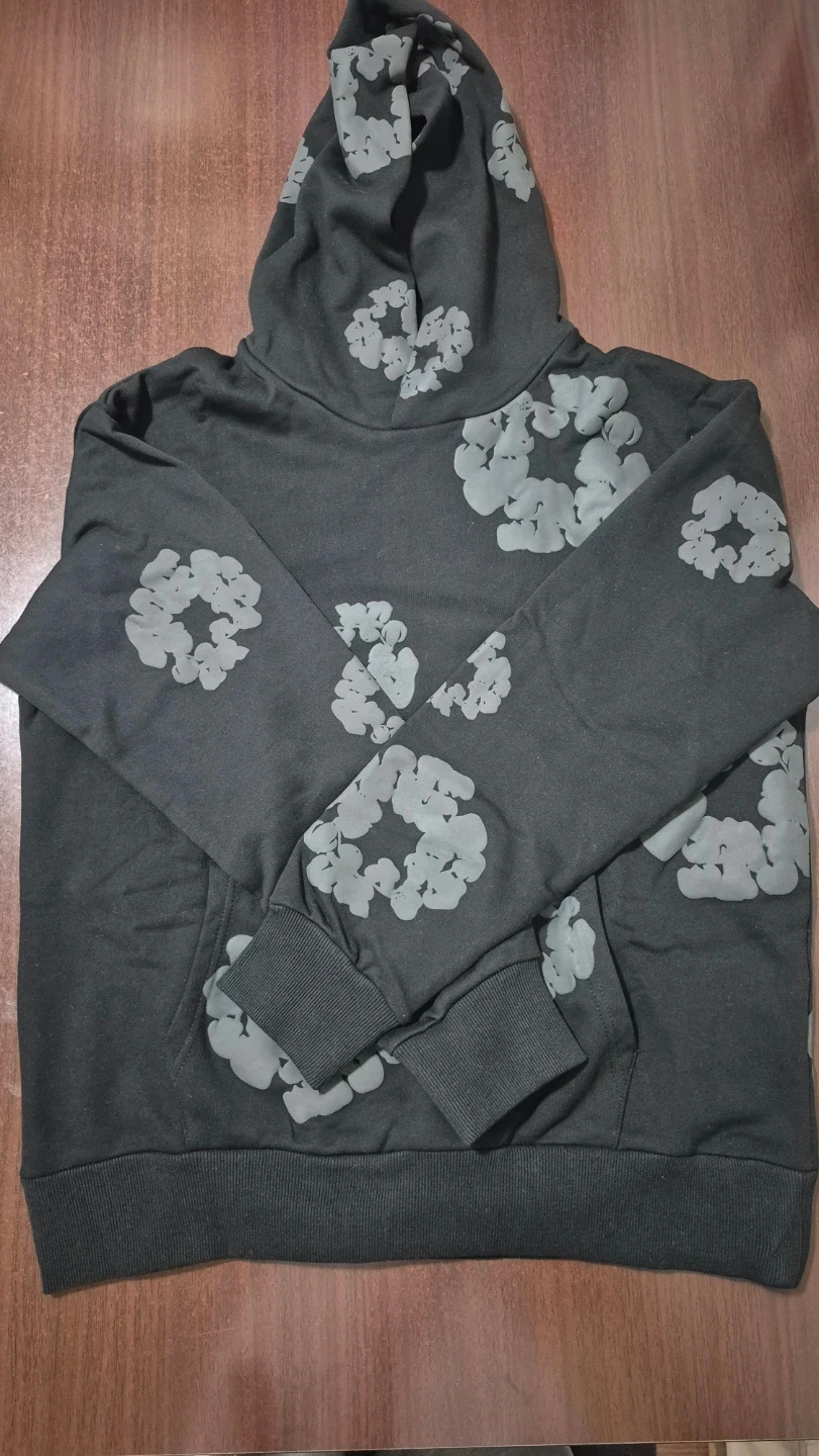 This black hoodie features a repeating grey graphic pattern. It's a pullover style with a front pouch pocket and a hood. Made from a soft fabric blend for comfort.