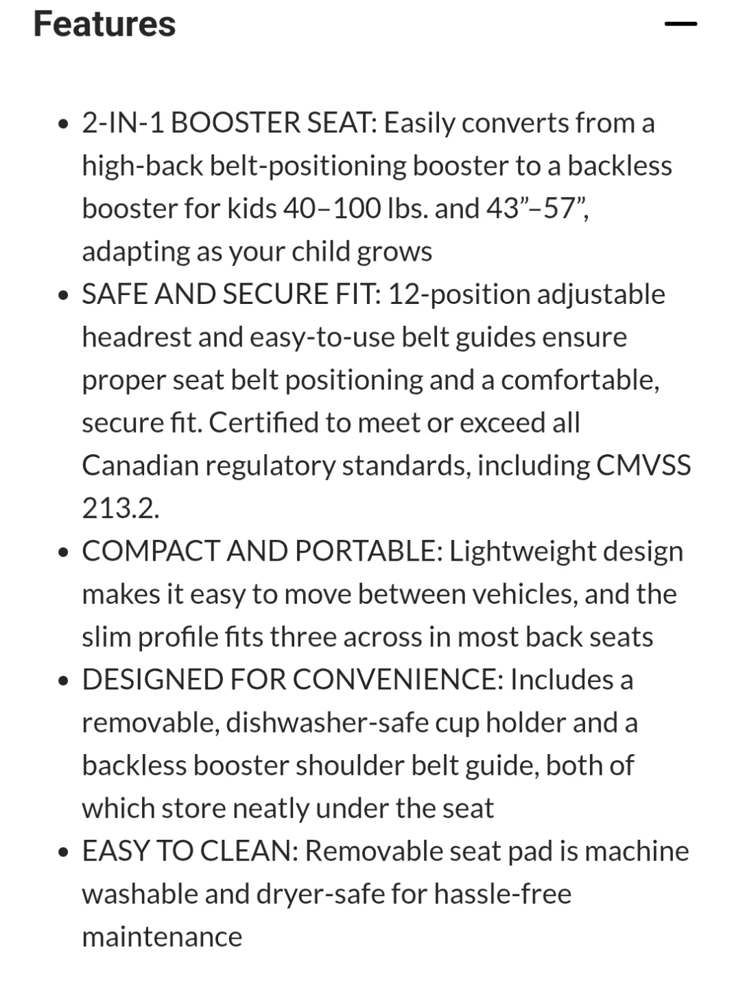 It features a 12-position adjustable headrest, easy-to-use belt guides for a secure fit, and meets all Canadian regulatory standards (CMVSS 213.2). π¨π¦ It's lightweight, portable, and designed for convenience with a removable, dishwasher-safe cup holder and a backless booster shoulder belt guide, both of which store neatly under the seat. π₯€
