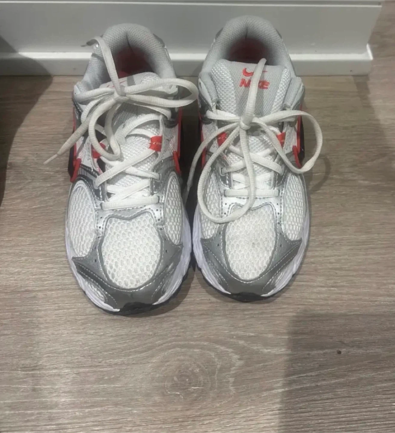 These are white and grey Nike running shoes with red accents. They feature a mesh upper for breathability and a cushioned sole. Perfect for everyday wear or light athletic activities!