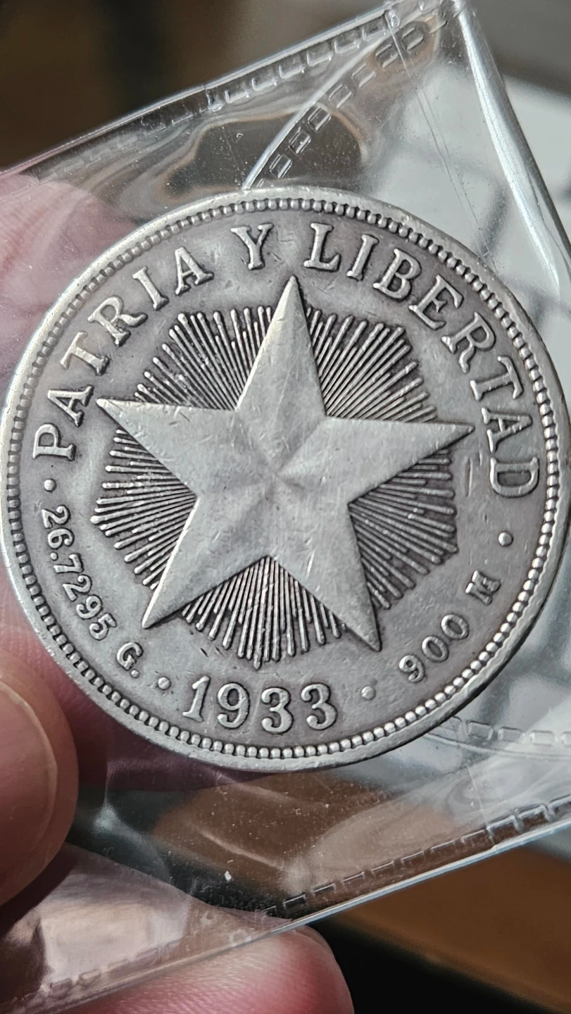 This is a 1933 silver un peso coin from the Republic of Cuba. It weighs 26.7295 grams and has a fineness of 900. Features a star on one side and the Cuban coat of arms on the other.