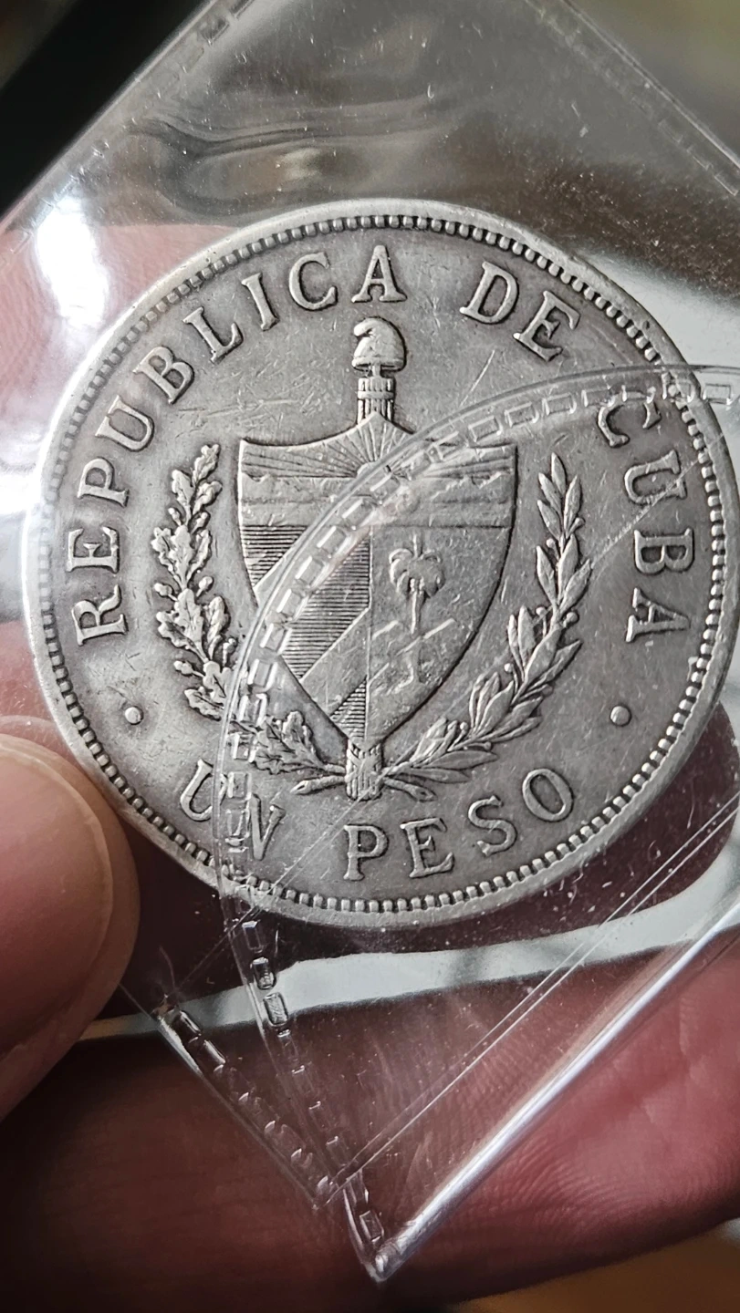 This is a 1933 silver un peso coin from the Republic of Cuba. It weighs 26.7295 grams and has a fineness of 900. Features a star on one side and the Cuban coat of arms on the other.