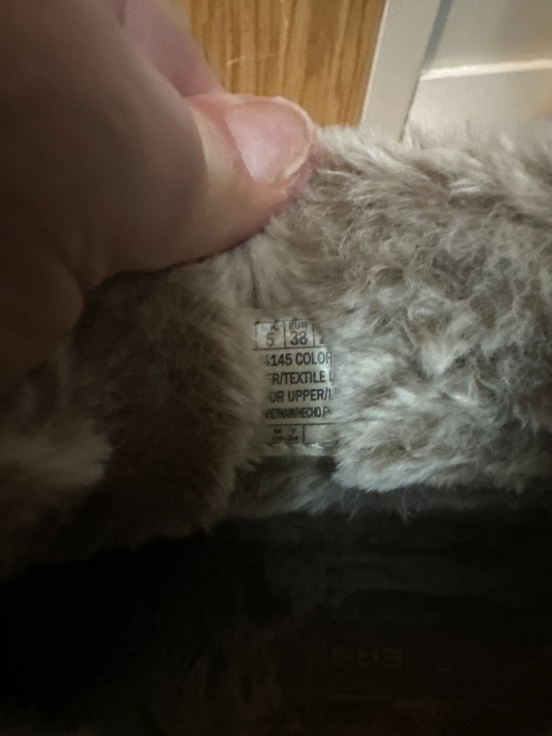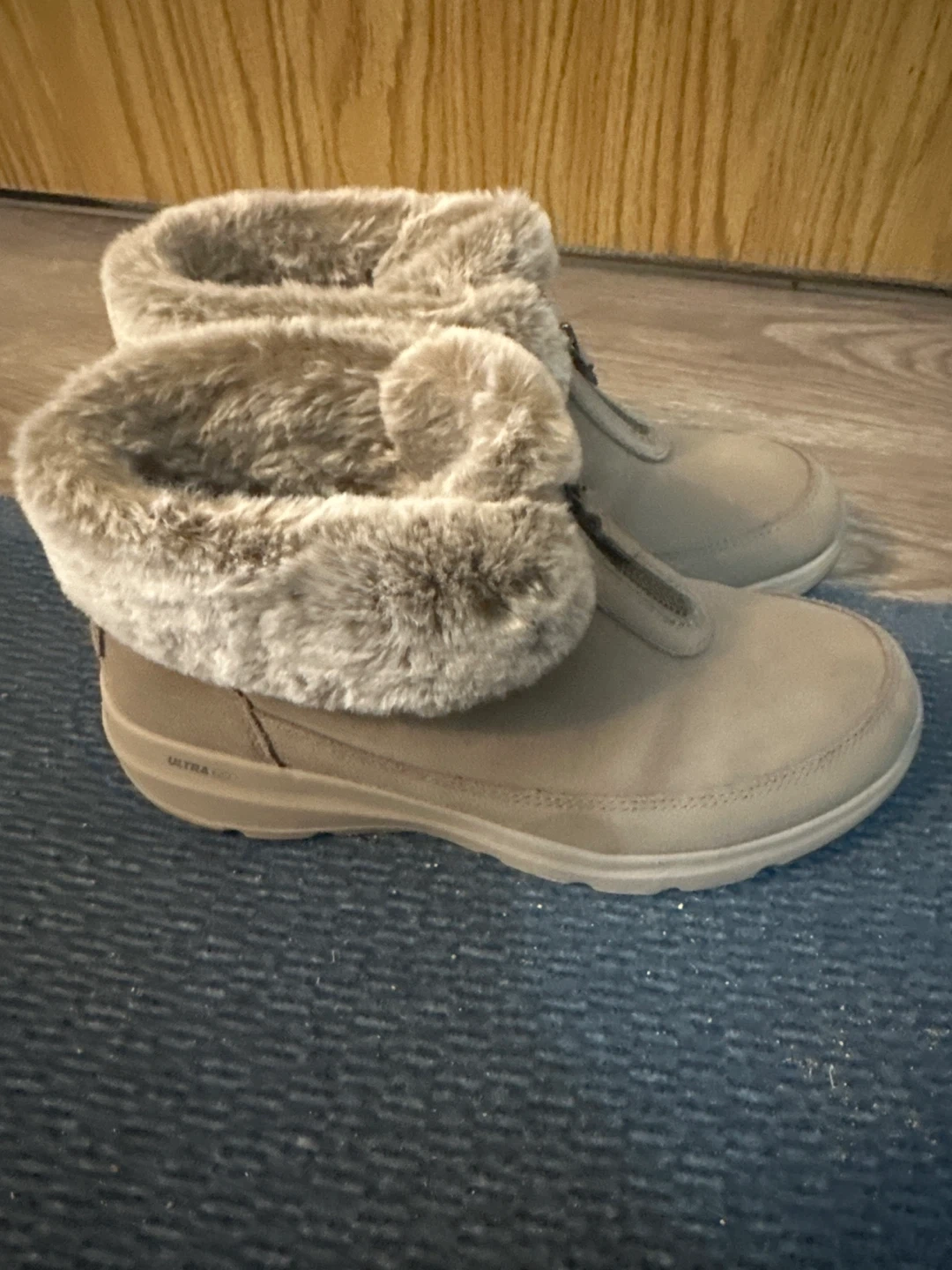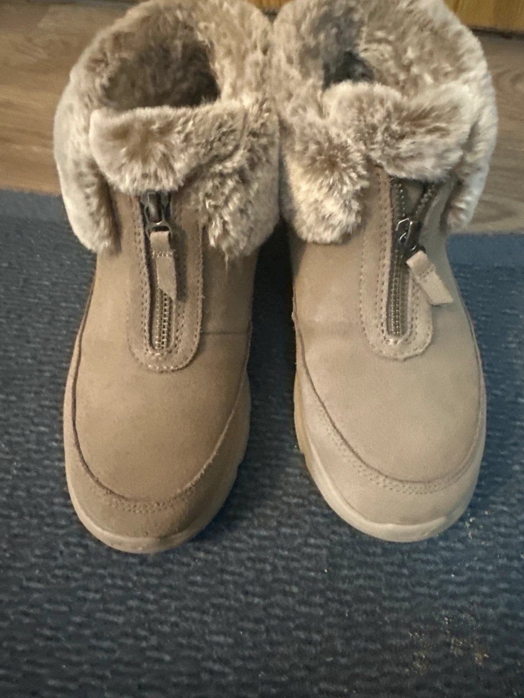 Cozy taupe Skechers boots with faux fur trim and front zipper closure. These boots feature a comfortable design, perfect for cooler weather. Size is 5 US / 38 EUR.