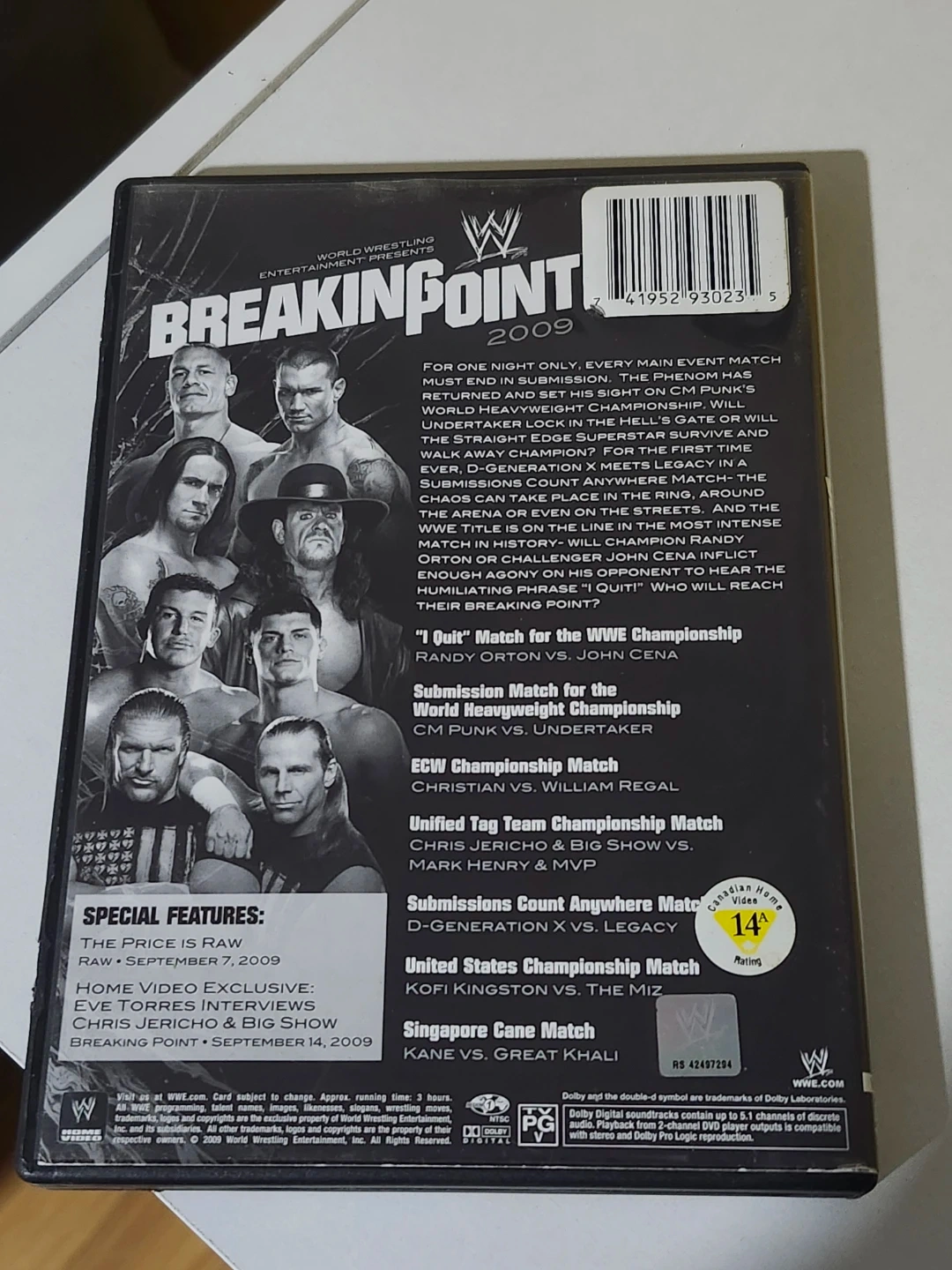 This DVD features the WWE Breaking Point 2009 event. It includes the main event submission match for the World Heavyweight Championship and other matches. Special features like "The Price is Raw," home video exclusives, and interviews are also included. This is a great addition for any wrestling fan!