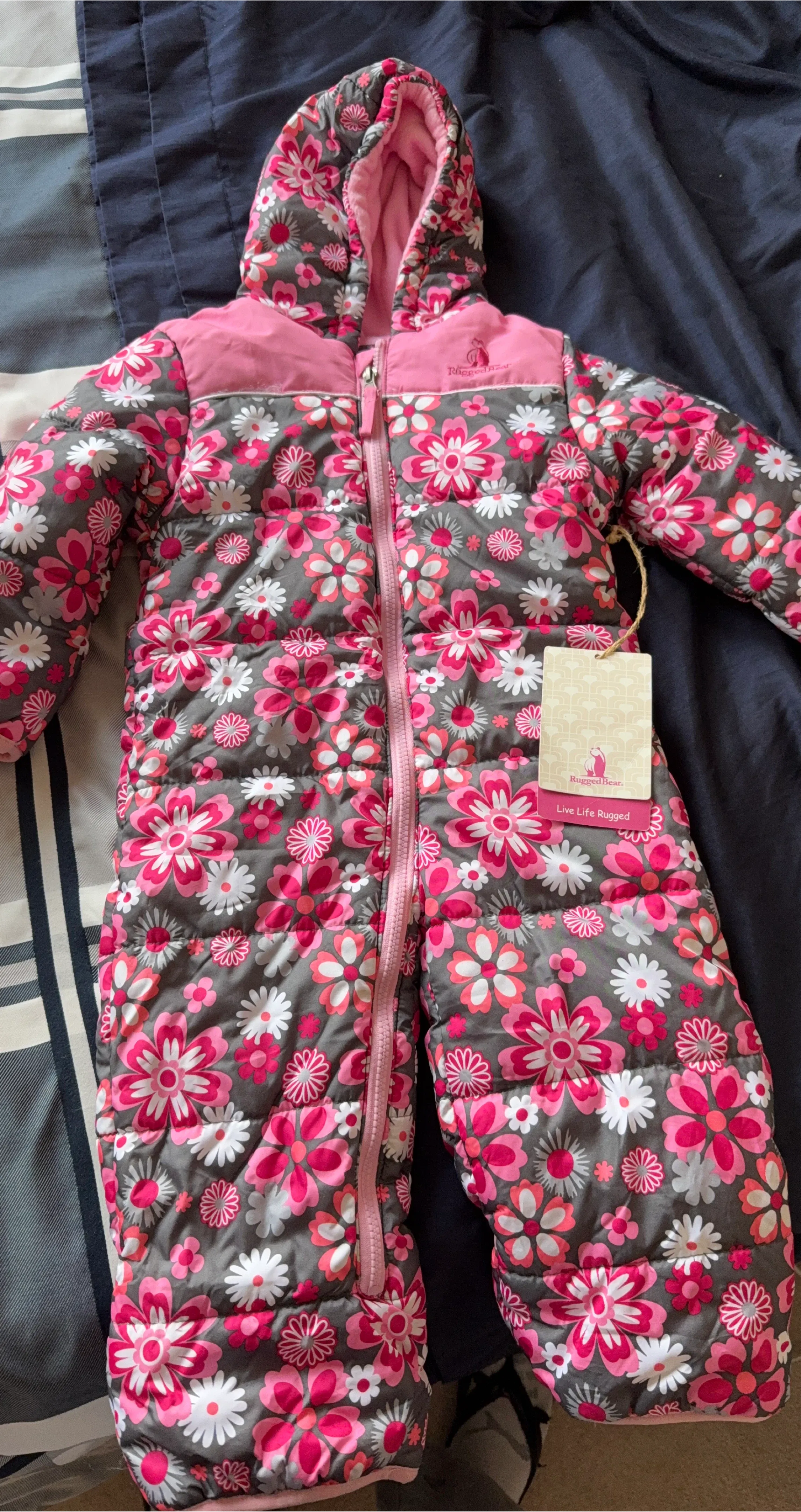 Brand new adorable Rugged Bear baby snowsuit with a charming pink floral pattern. It features a full zip closure for easy dressing. This snowsuit is perfect for keeping your little one warm and cozy during colder weather! Size 24m