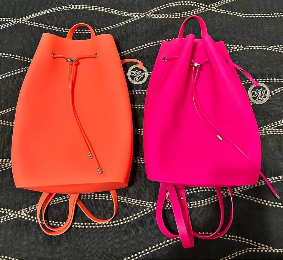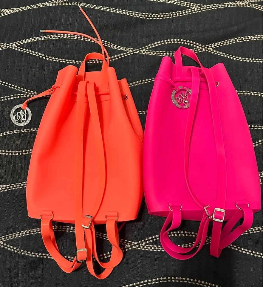 I have two beautiful brand new American Jewel silicone gummy bucket backpacks for sale. They measure about 12 1/2 inches tall with a drawstring closure. Easy to clean since they are rubber! Both are new and never used.