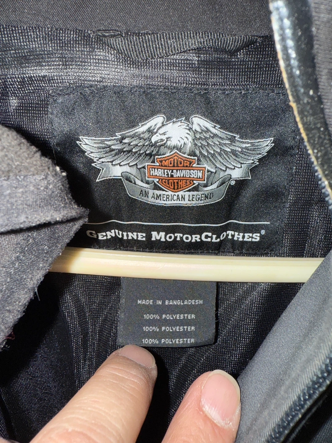Harley-Davidson motorcycle jacket, made in Bangladesh. The jacket is made of 100% polyester. It features the Harley-Davidson logo with a skull design. Great for Harley enthusiasts!