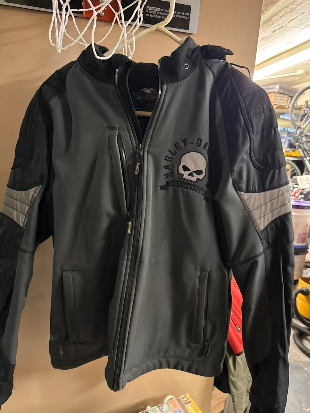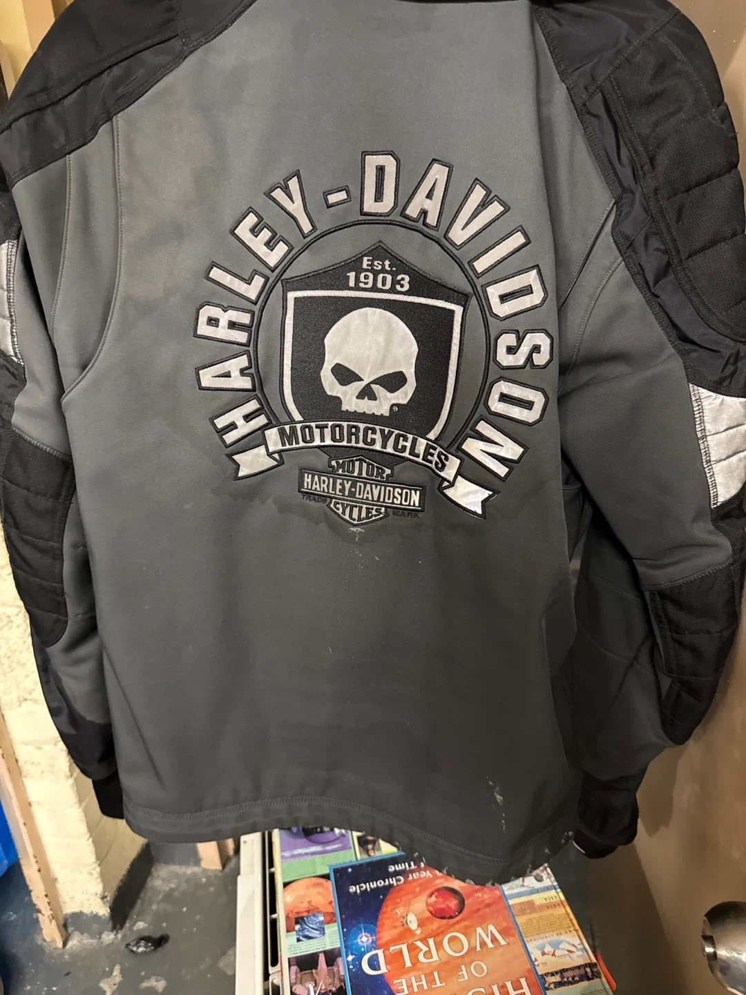Harley-Davidson motorcycle jacket, made in Bangladesh. The jacket is made of 100% polyester. It features the Harley-Davidson logo with a skull design. Great for Harley enthusiasts!