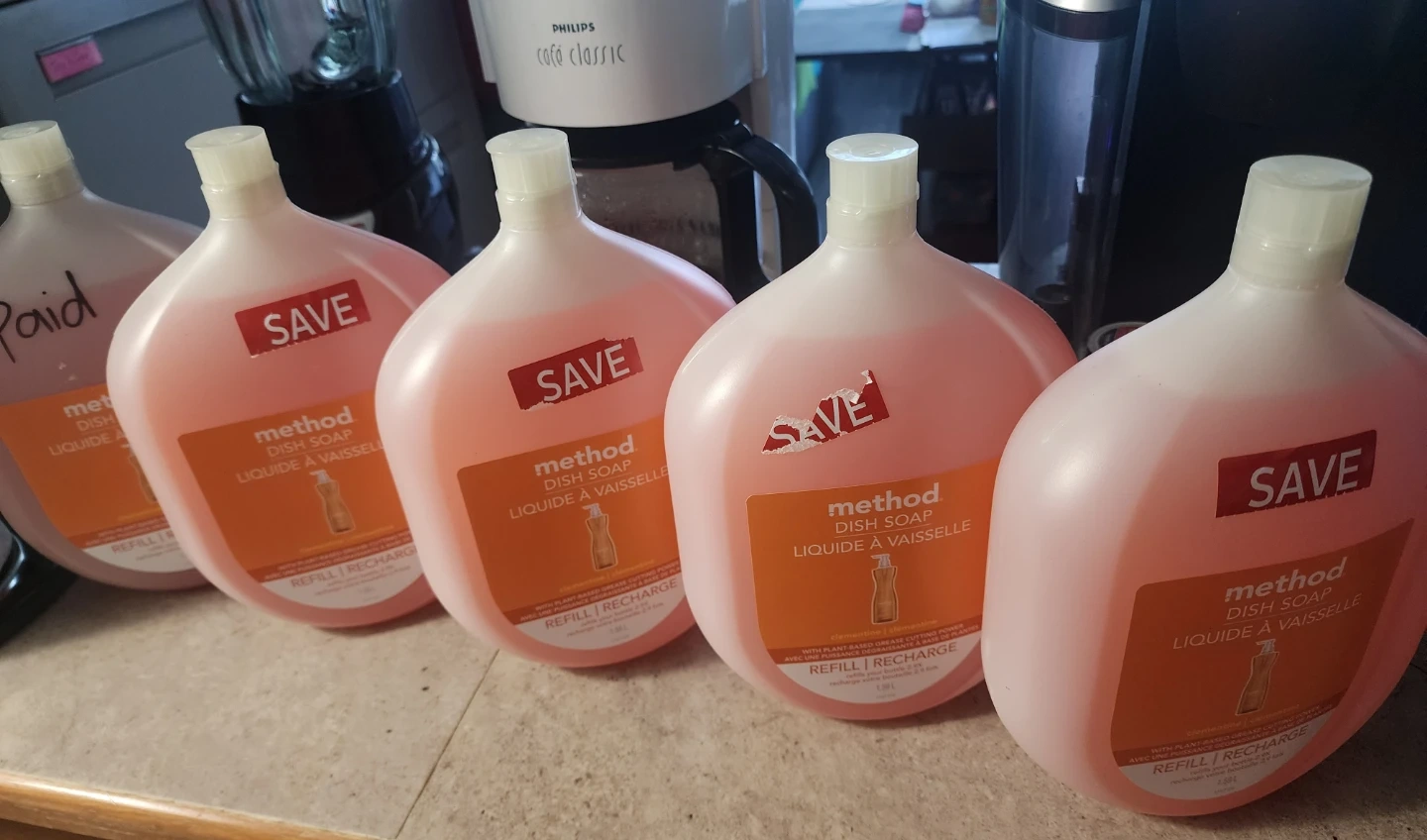 Four large bottles of Method dish soap refill. It's a plant-based formula with grease cutting power. Each bottle contains 1.5L.