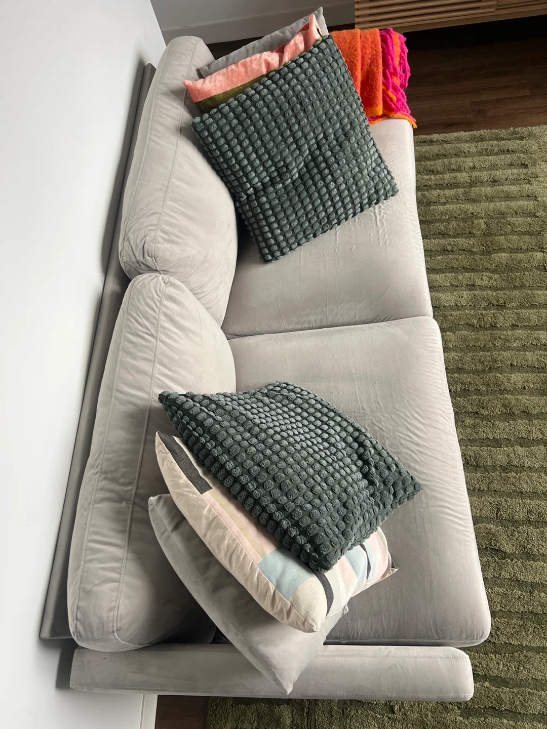 This stylish modern sofa is upholstered in soft velvet and includes two matching large accent pillows in matching fabric