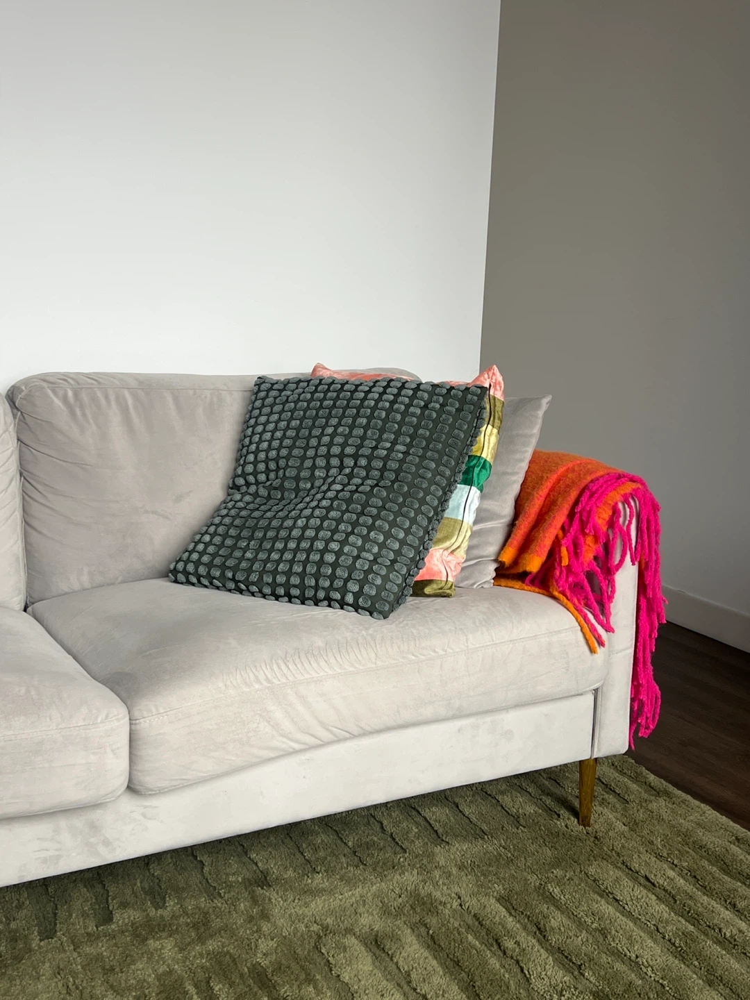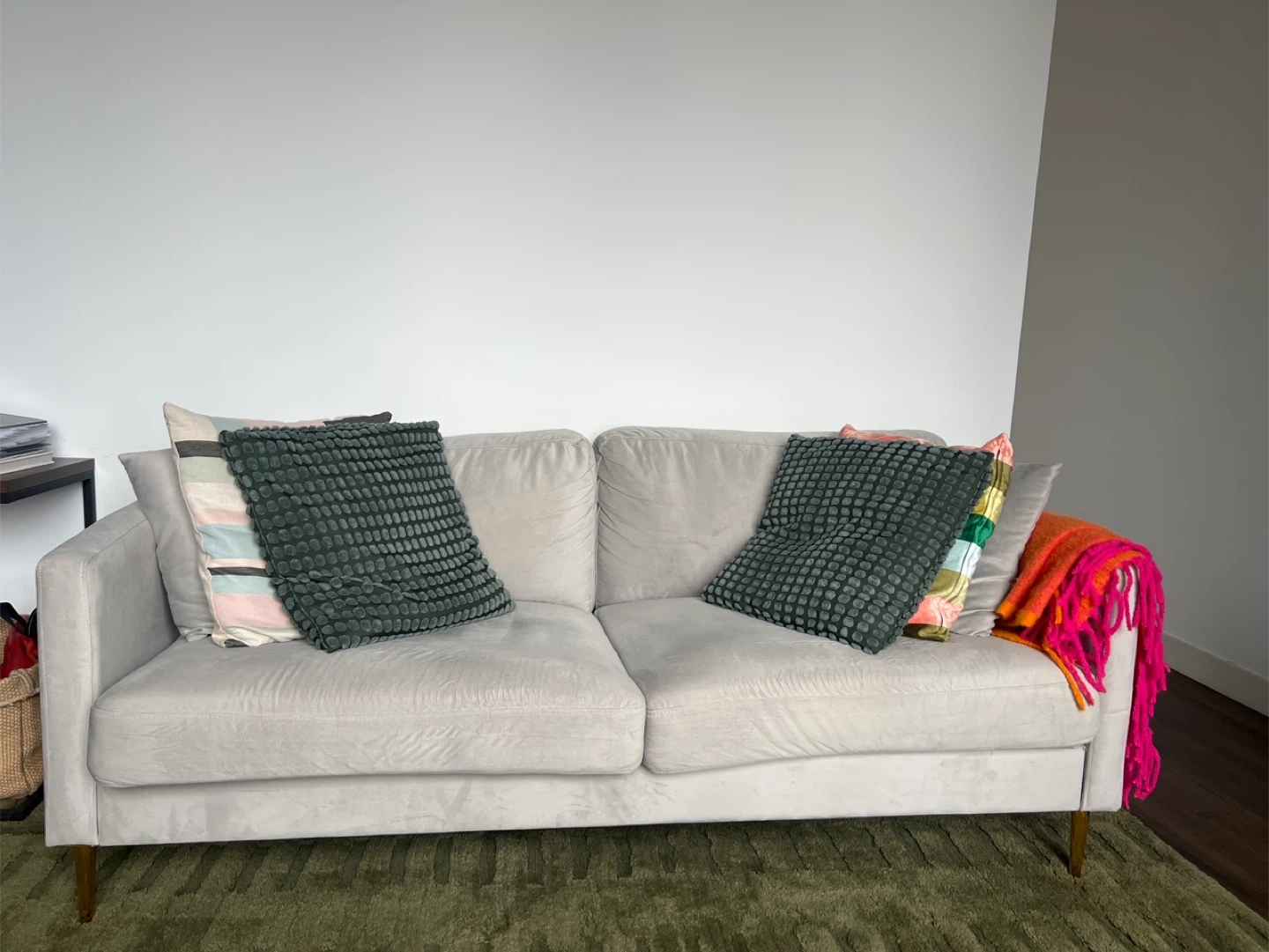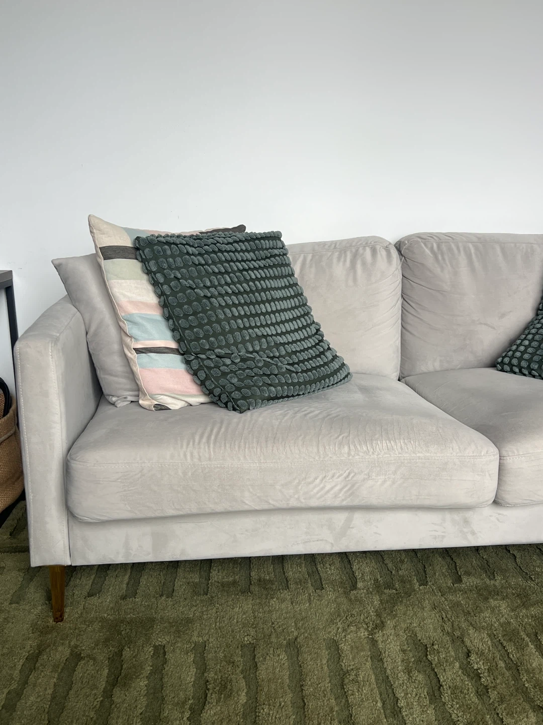 This stylish modern sofa is upholstered in soft velvet and includes two matching large accent pillows in matching fabric