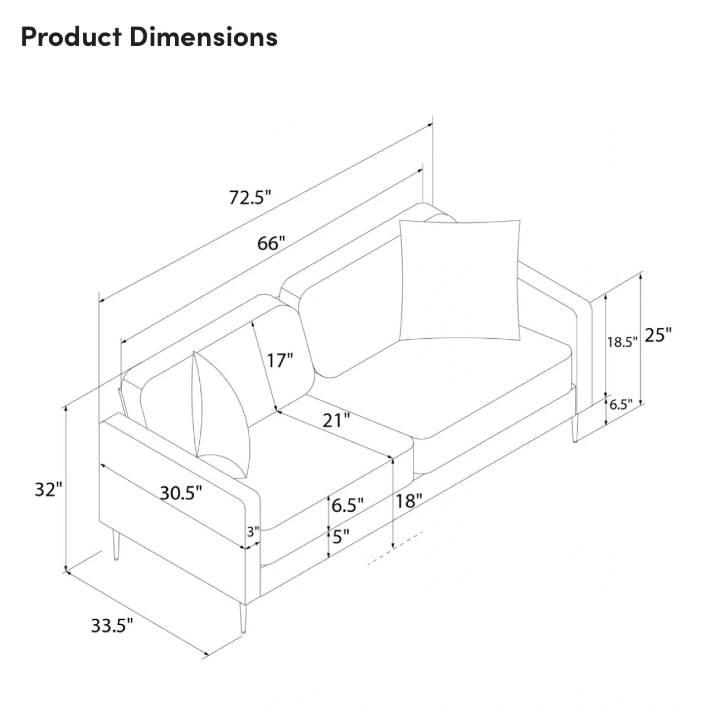 Sturdy plywood construction with 6.5" solid metal gold finish legs and thin track arms make this couch the perfect small space accent piece in your living room, guest room, office, or den.