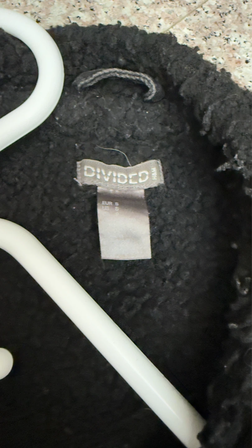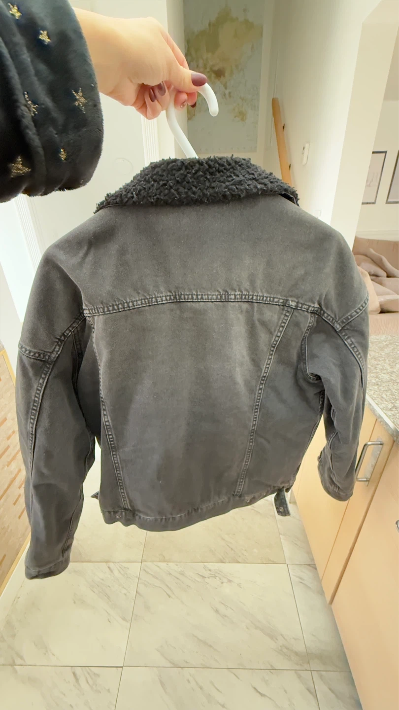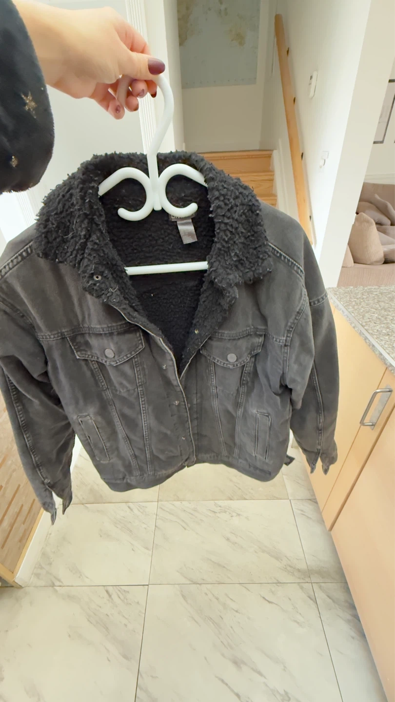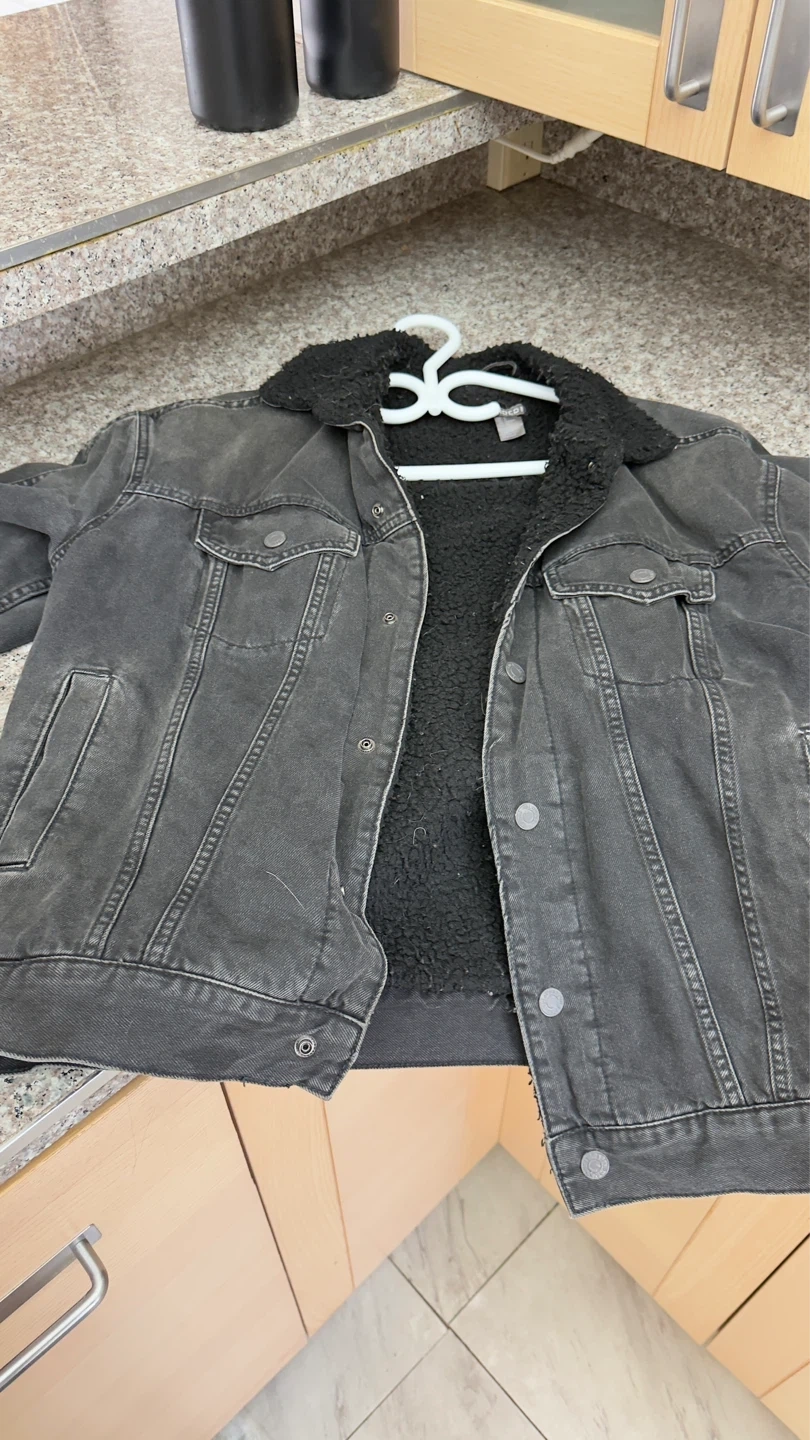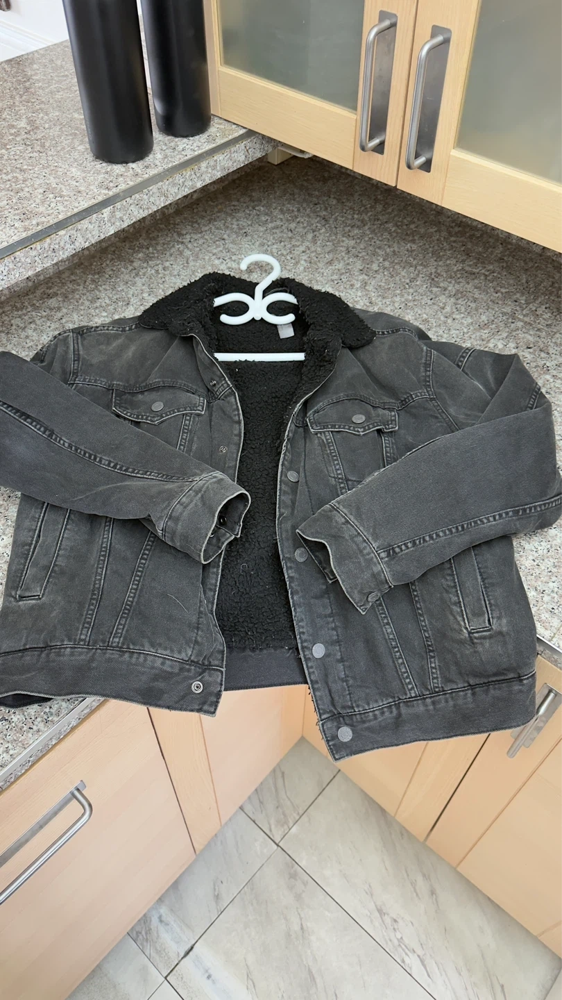 Warm and stylish black denim jacket from DIVIDED by H&M. It features a cozy sherpa lining throughout for extra warmth. Perfect for cooler weather!