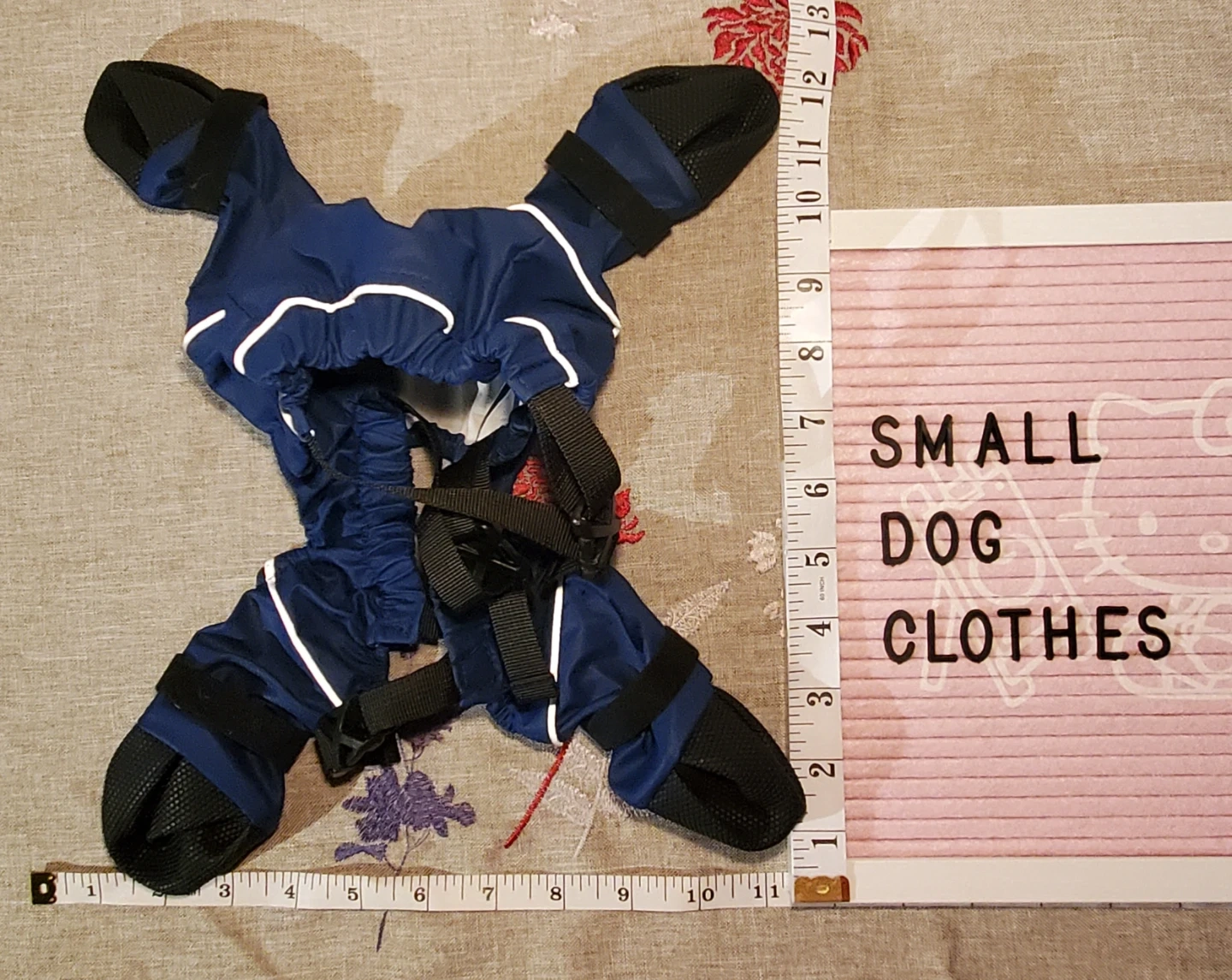 This XS navy blue dog snowsuit features integrated boots for full coverage. It's designed for small dogs and has adjustable straps for a secure fit. Reflective trim for visibility.