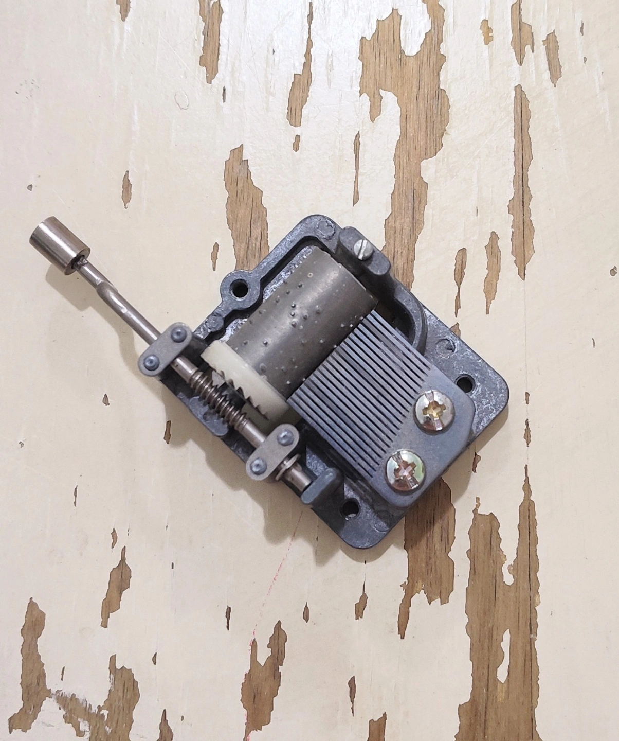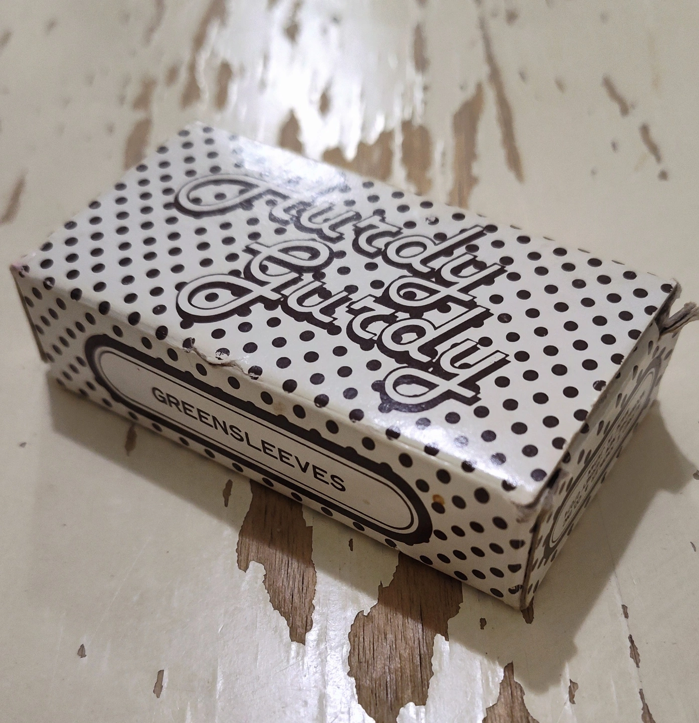 Tiny Alfred E. Knobler & Co., Inc. tiny hand crank music box that plays 'Greensleeves' with small gears and a cylinder. The box has a polka dot pattern 'Hurdy Gurdy'. Likely Vintage these were made beginning in 1970 in Japan. Cardboard paper box has some wear. 1.5 X .75 X 3" (3" to end of crank).