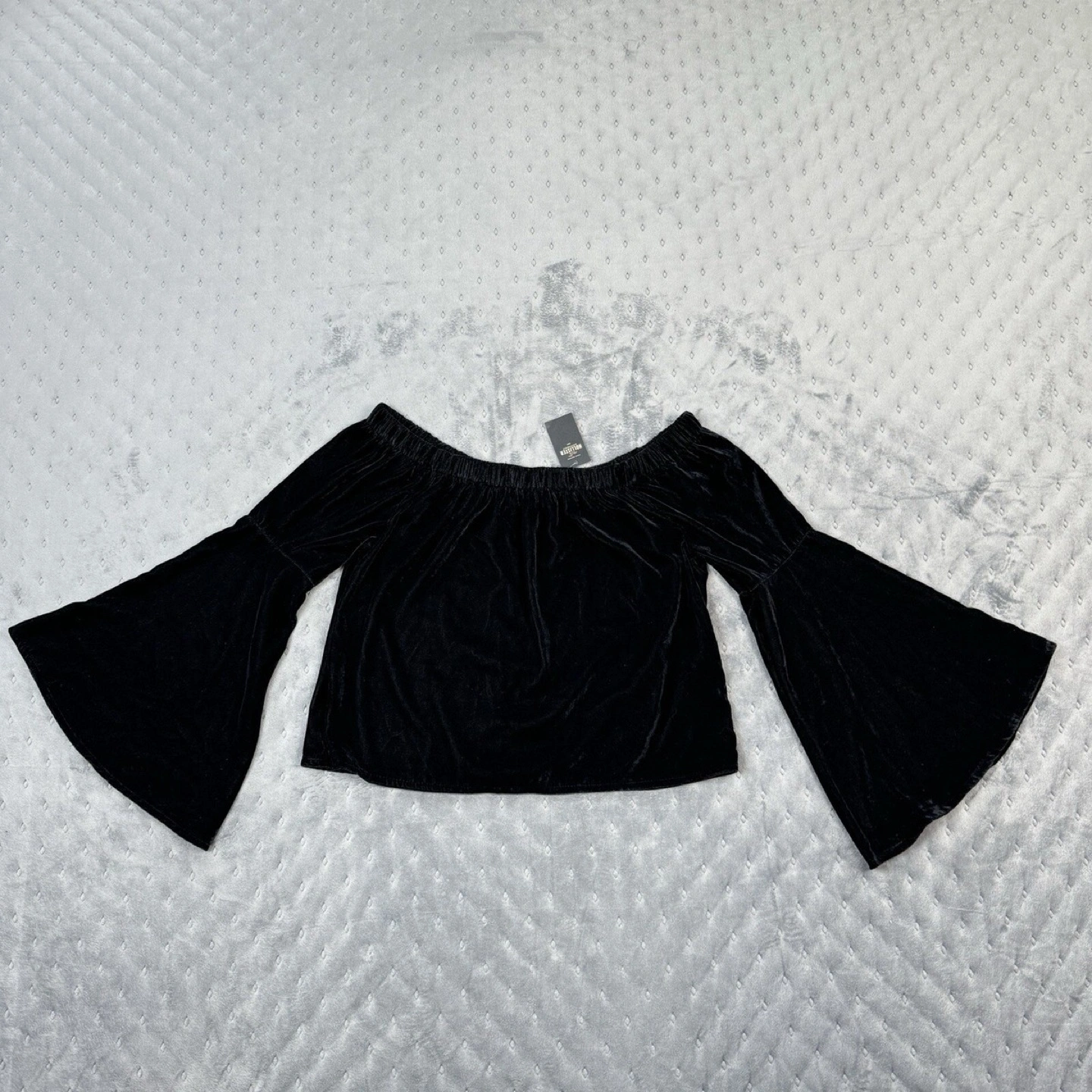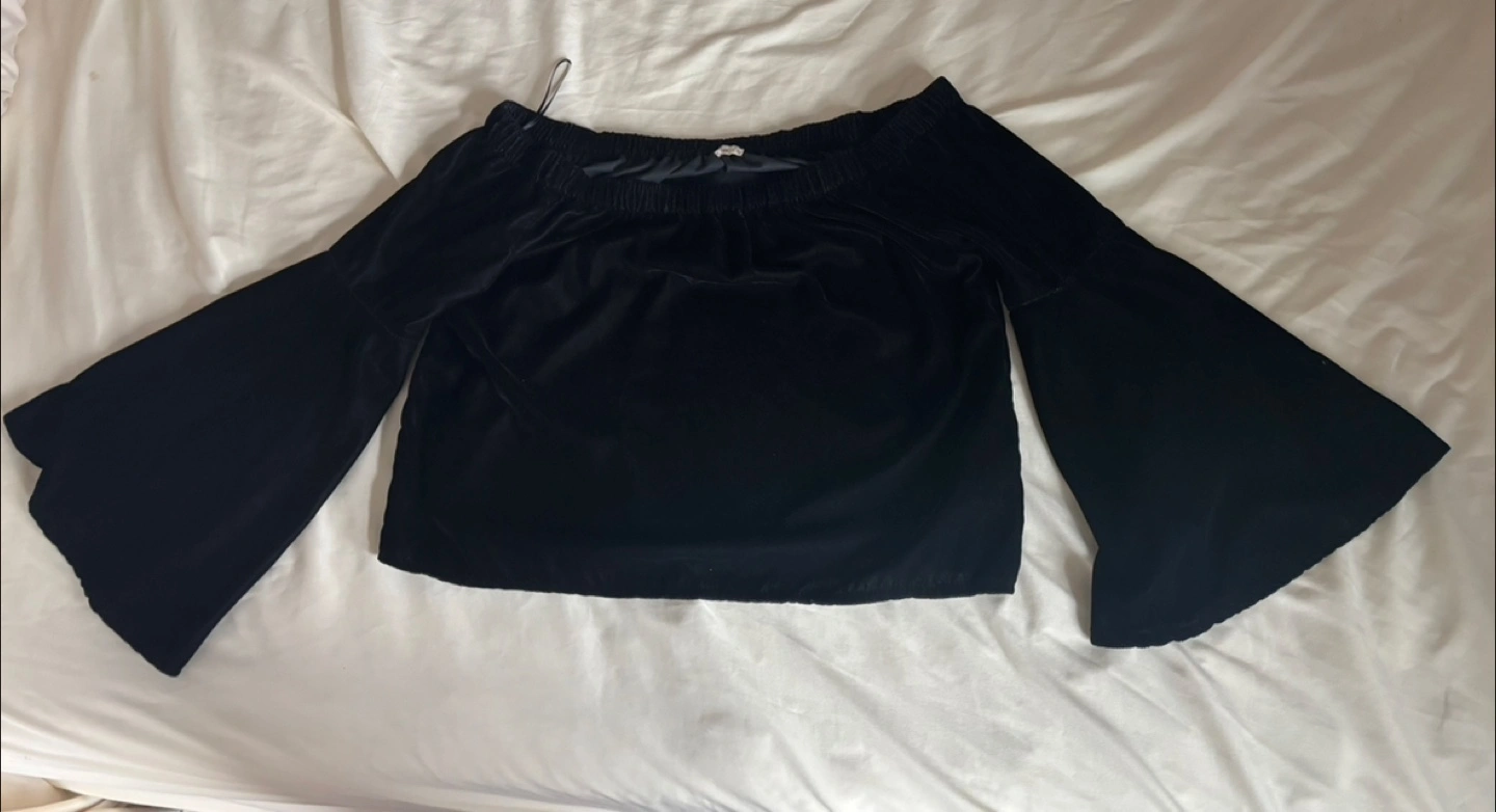 Black velvet top. Off-the-shoulder design. Bell sleeves. Size Medium. Soft material