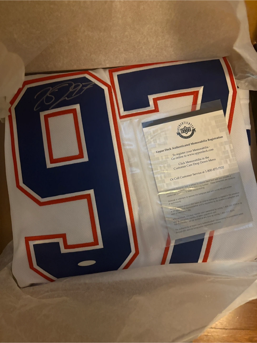 This is an Upper Deck Authenticated memorabilia jersey featuring the number 97. It comes in its original box and packaging. Registration information is included. This item is suitable for sports memorabilia collectors. Authenticated by Upperdeck with code and holographic sticker to check.