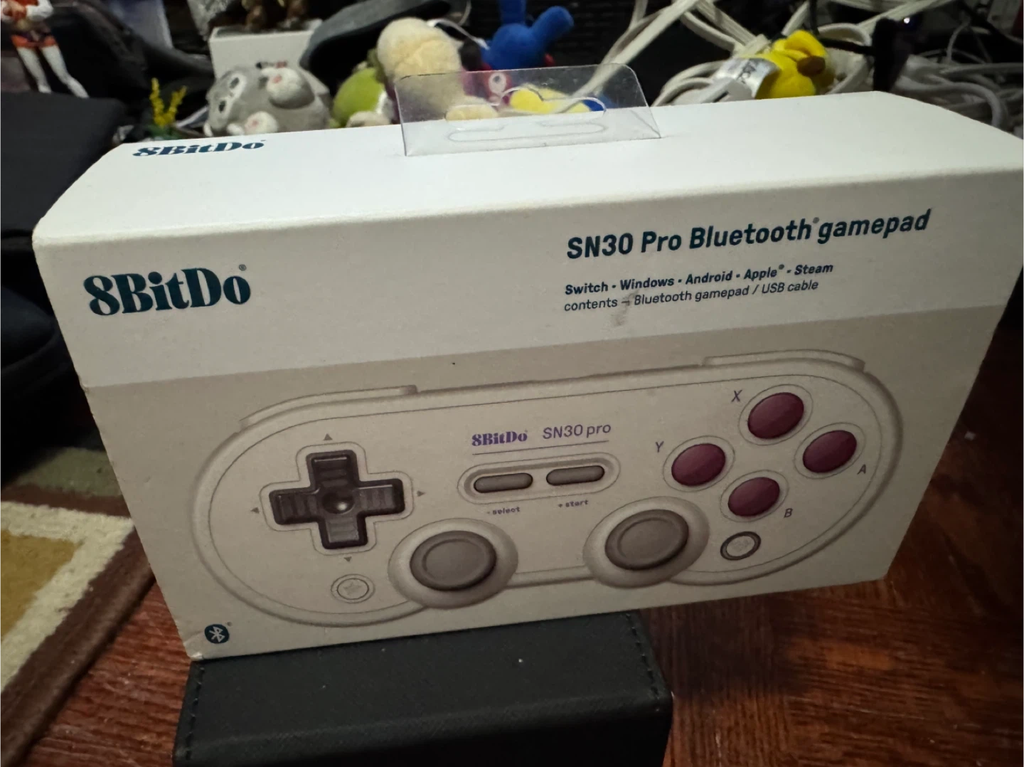 This is the 8BitDo SN30 Pro Bluetooth gamepad. It's compatible with Switch, Windows, Android, Apple, and Steam. Comes with a Bluetooth gamepad and USB cable.
