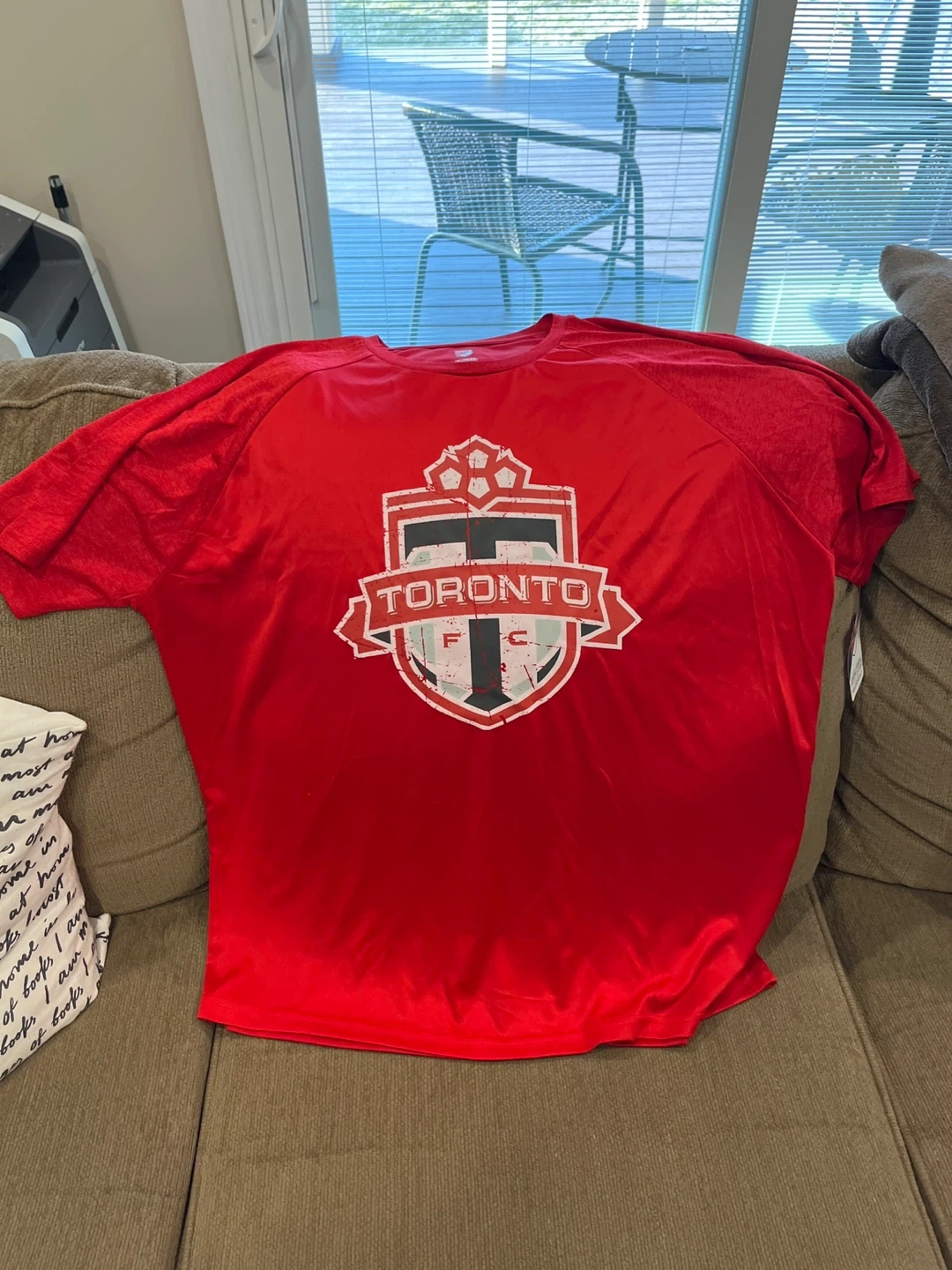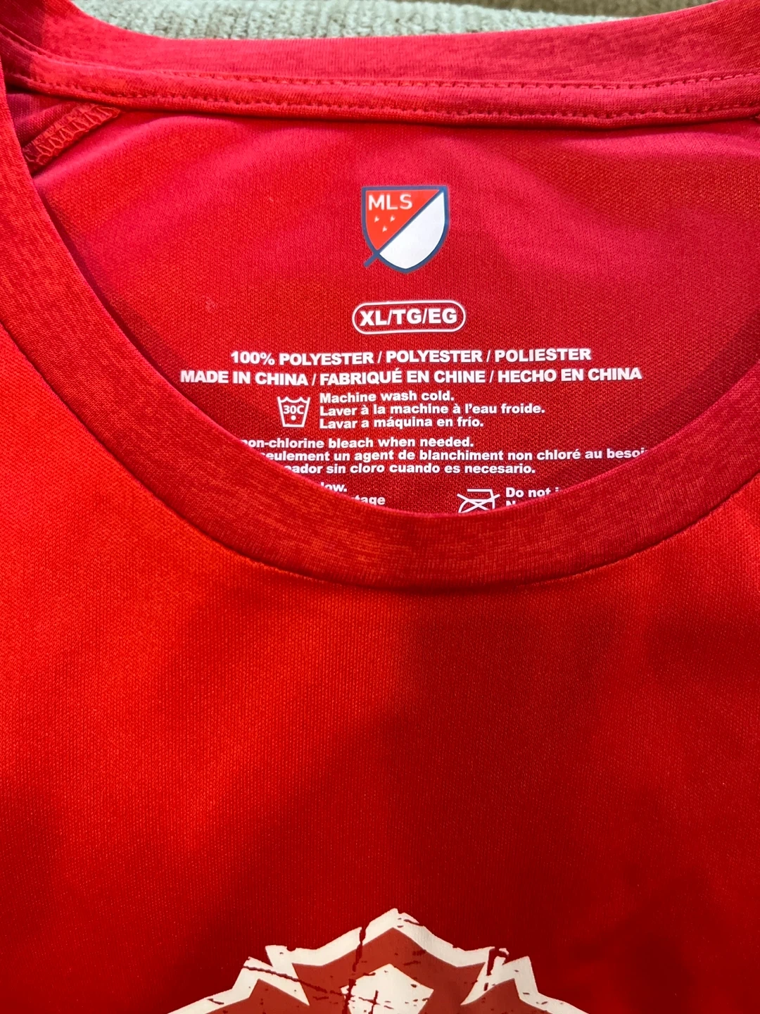 Toronto FC MLS t-shirt in red. It's size XL/TG/EG and made of 100% polyester. Manufactured in China.