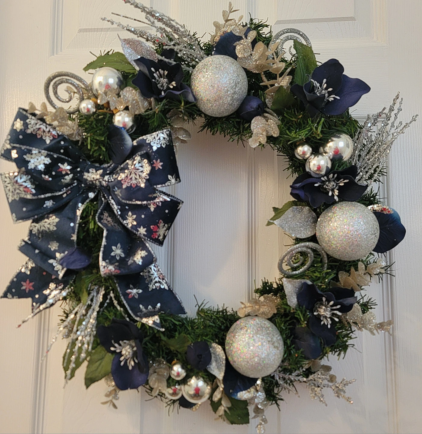 This beautiful Christmas wreath features a navy blue bow with a snowflake pattern and is adorned with silver ornaments and dark blue flowers. It's made with artificial evergreen branches and sparkly accents. Great for adding holiday cheer to your front door!