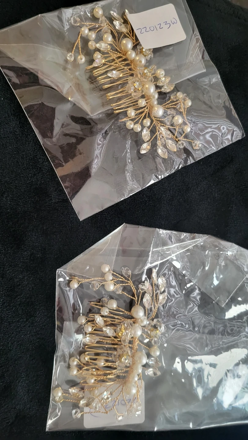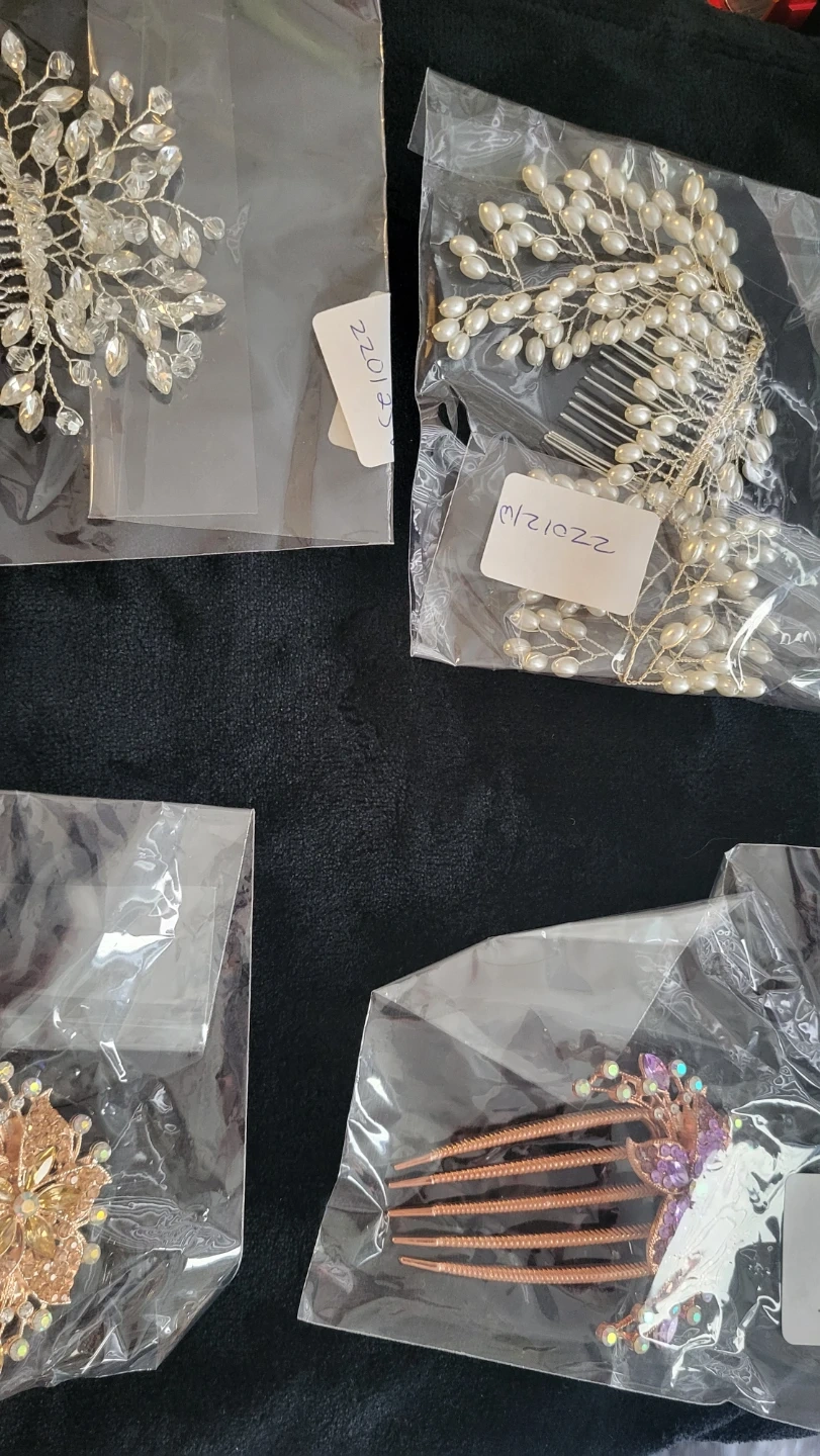 This set includes four beautiful hair combs adorned with faux pearls and sparkling crystals. Each comb features a unique design, perfect for adding a touch of elegance to updos or hairstyles. They're great for weddings, parties, or special occasions! 5.00 per pkg
