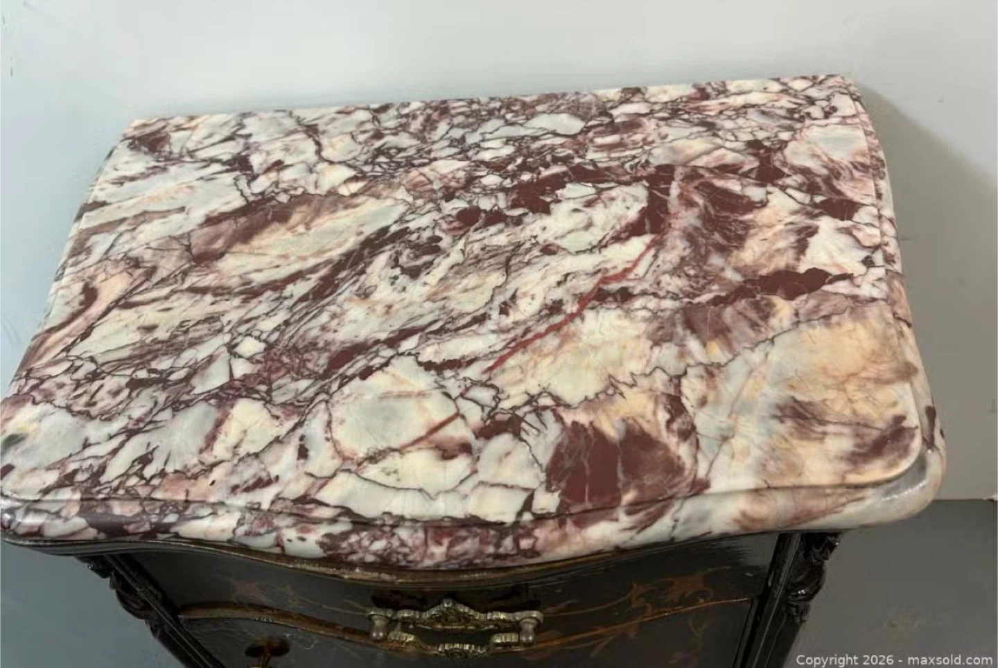 This is a classic nightstand with a beautiful marble top. It features intricate wood inlay detailing on the drawer and door fronts. The ornate hardware and carved legs add to its vintage charm. It's a stylish addition to any bedroom!