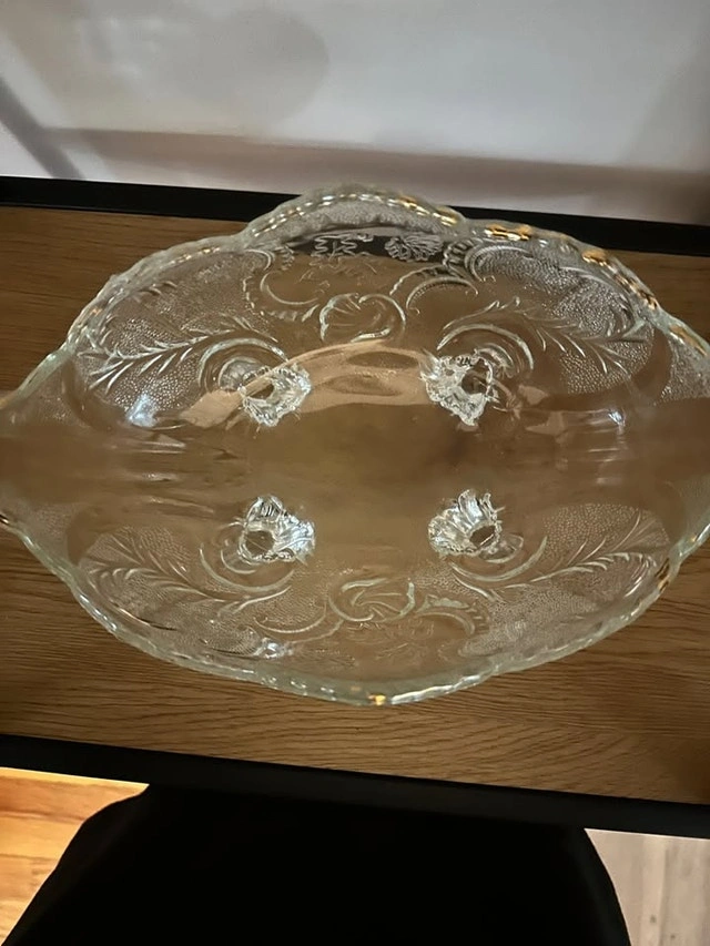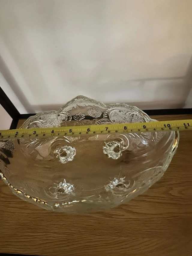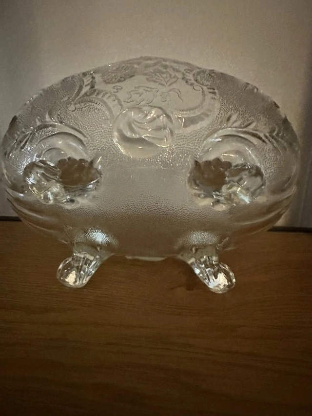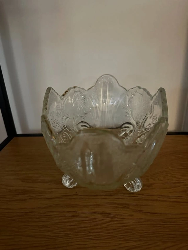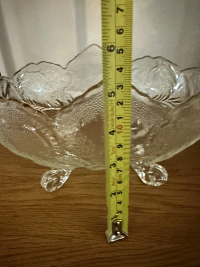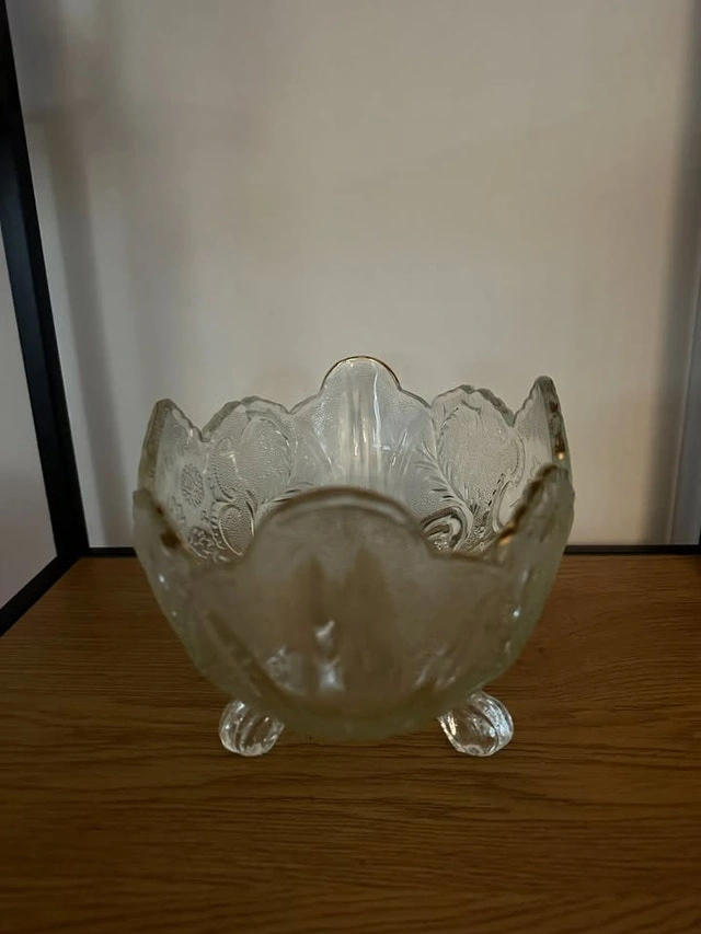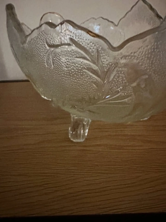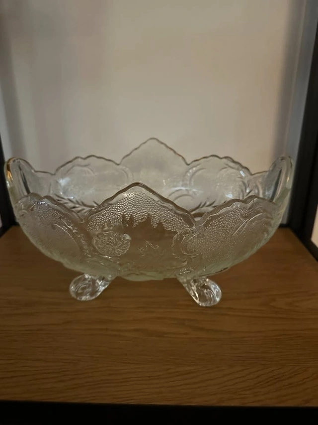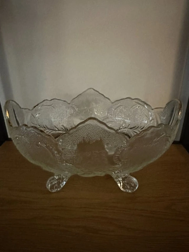 Vintage Jeannette oval footed pressed clear glass bowl with embossed leaves and vines. Gold trim has faded over time. Great for a fruit bowl or centerpiece. Excellent vintage condition. Refer to pictures for measurements and condition.