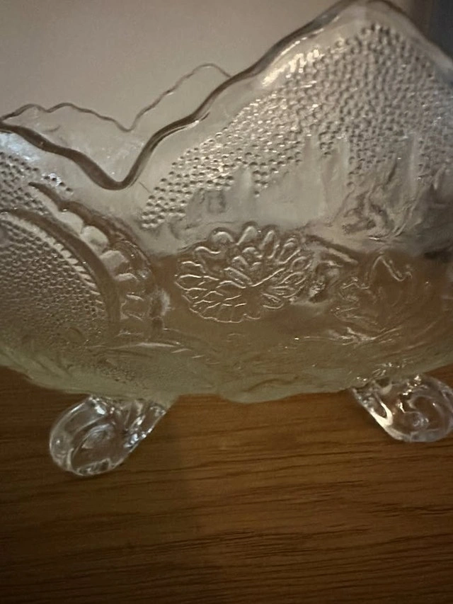 Vintage Jeannette oval footed pressed clear glass bowl with embossed leaves and vines. Gold trim has faded over time. Great for a fruit bowl or centerpiece. Excellent vintage condition. Refer to pictures for measurements and condition.