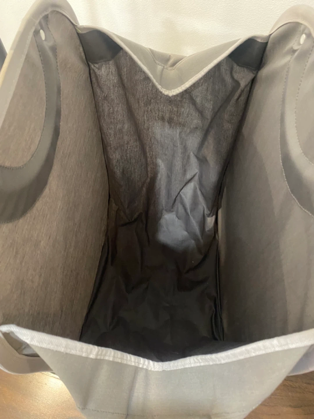 Here's a handy double laundry hamper sorter! It's perfect for keeping your whites and darks separate, or for organizing different family members' clothes. The grey colour is neutral and will fit in with any decor. It's in great shape and ready to help you tackle laundry day