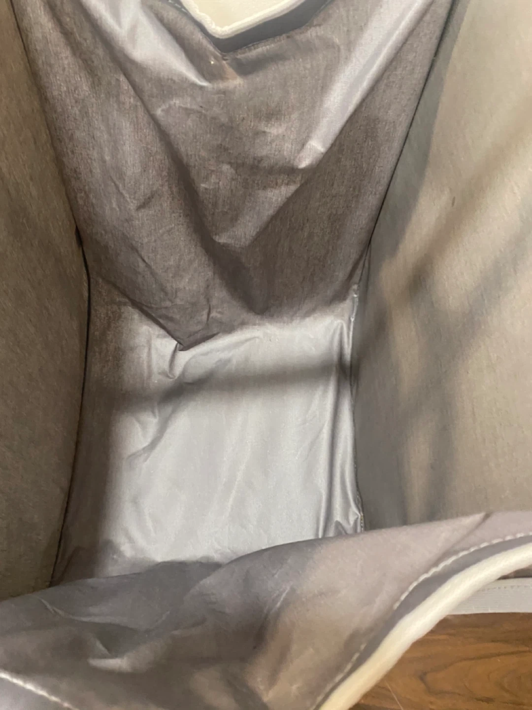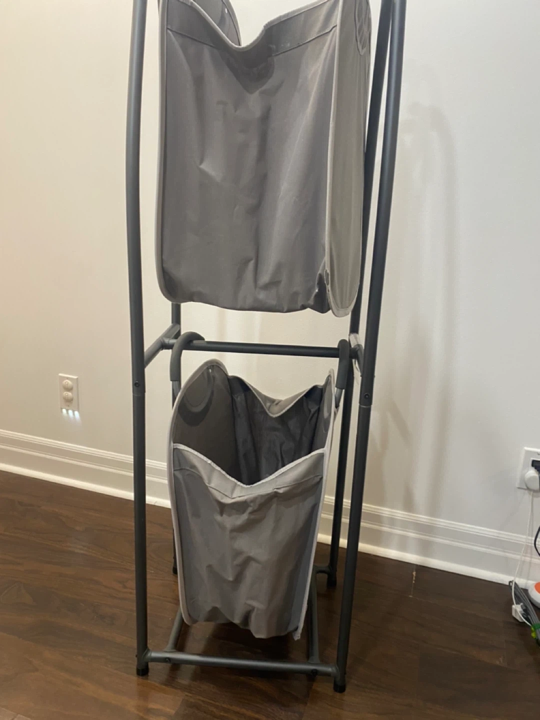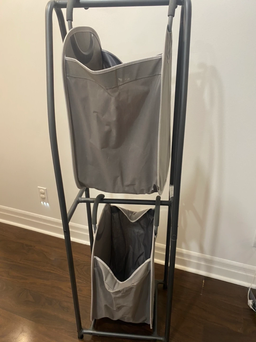 Here's a handy double laundry hamper sorter! It's perfect for keeping your whites and darks separate, or for organizing different family members' clothes. The grey colour is neutral and will fit in with any decor. It's in great shape and ready to help you tackle laundry day
