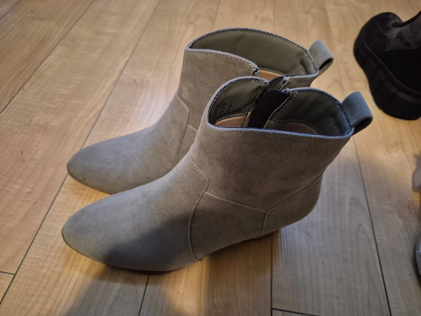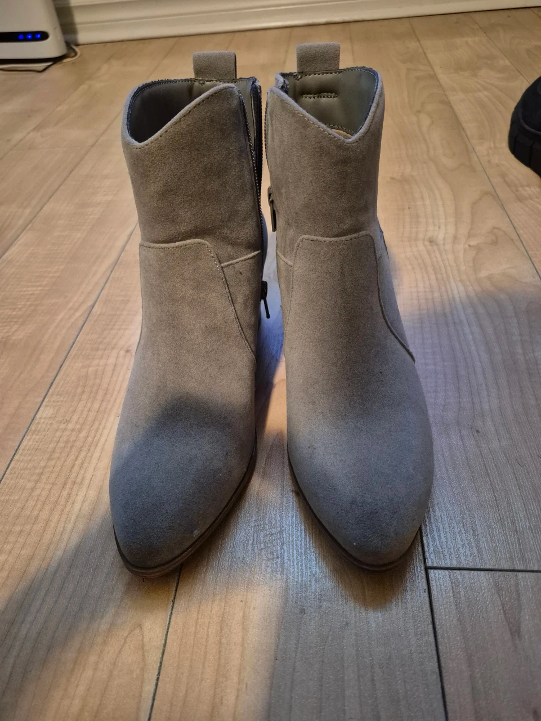 These are stylish grey ankle boots made from faux suede. They feature a convenient side zipper for easy wear. Perfect for casual outings or dressing up an outfit!