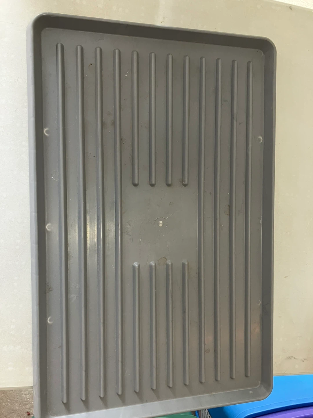 A grey plastic utility tray with raised ridges. Great for organizing or protecting surfaces. Made of durable plastic.