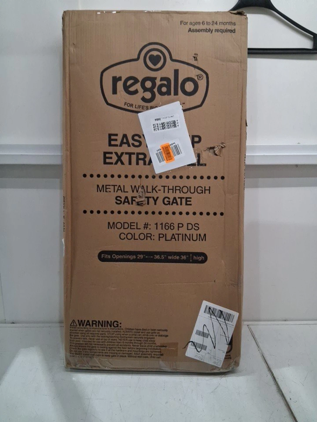 Regalo Easy Extra Tall Metal Walk-Through Safety Gate. Fits openings 29"-36.5" wide and 36" high. It's platinum in color and designed for ages 6 to 24 months. This gate is great for keeping little ones safe!