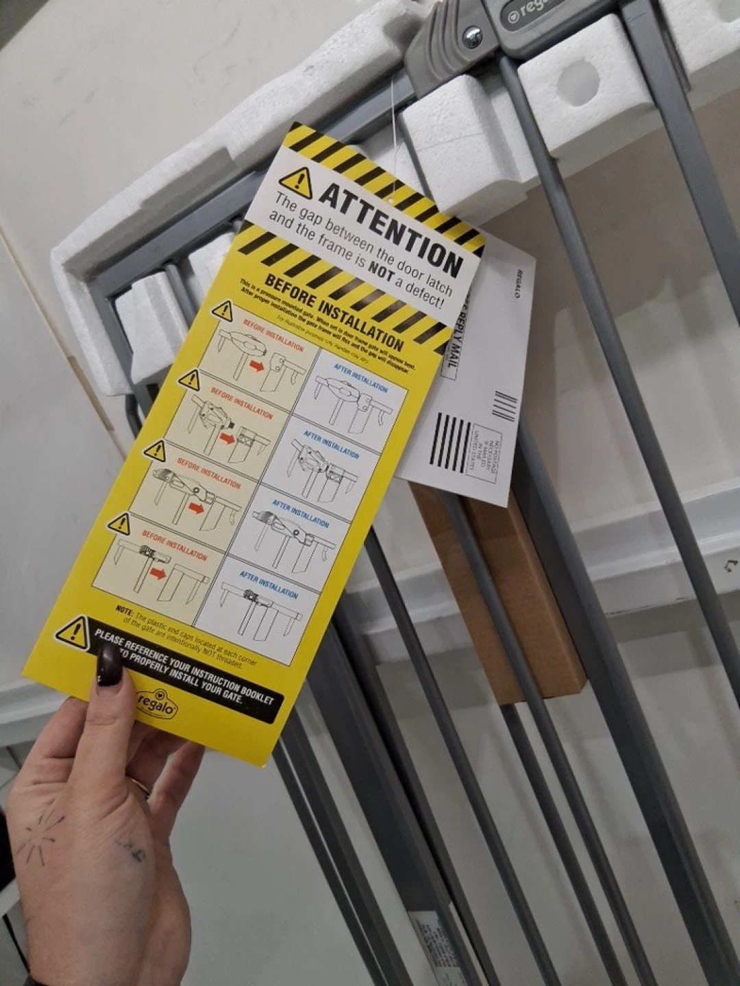 Regalo Easy Extra Tall Metal Walk-Through Safety Gate. Fits openings 29"-36.5" wide and 36" high. It's platinum in color and designed for ages 6 to 24 months. This gate is great for keeping little ones safe!