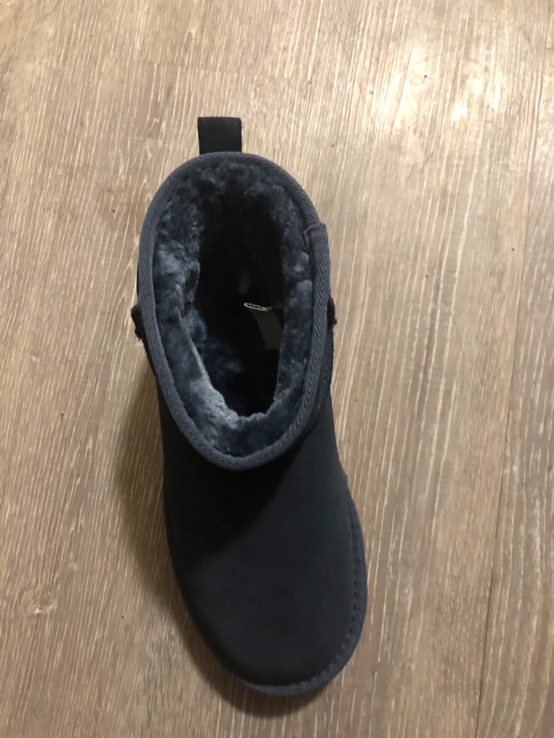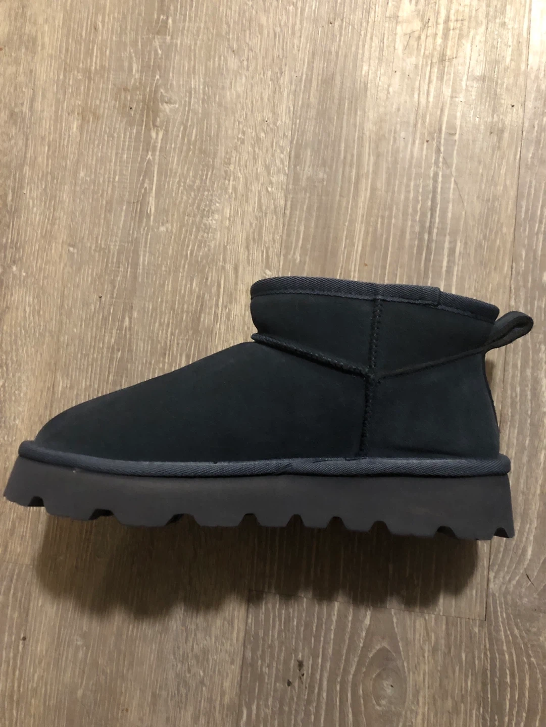 UGG Classic Ultra Mini boots in navy. Features a suede upper and sheepskin lining. Has a durable rubber sole. Not Ugg, just offb