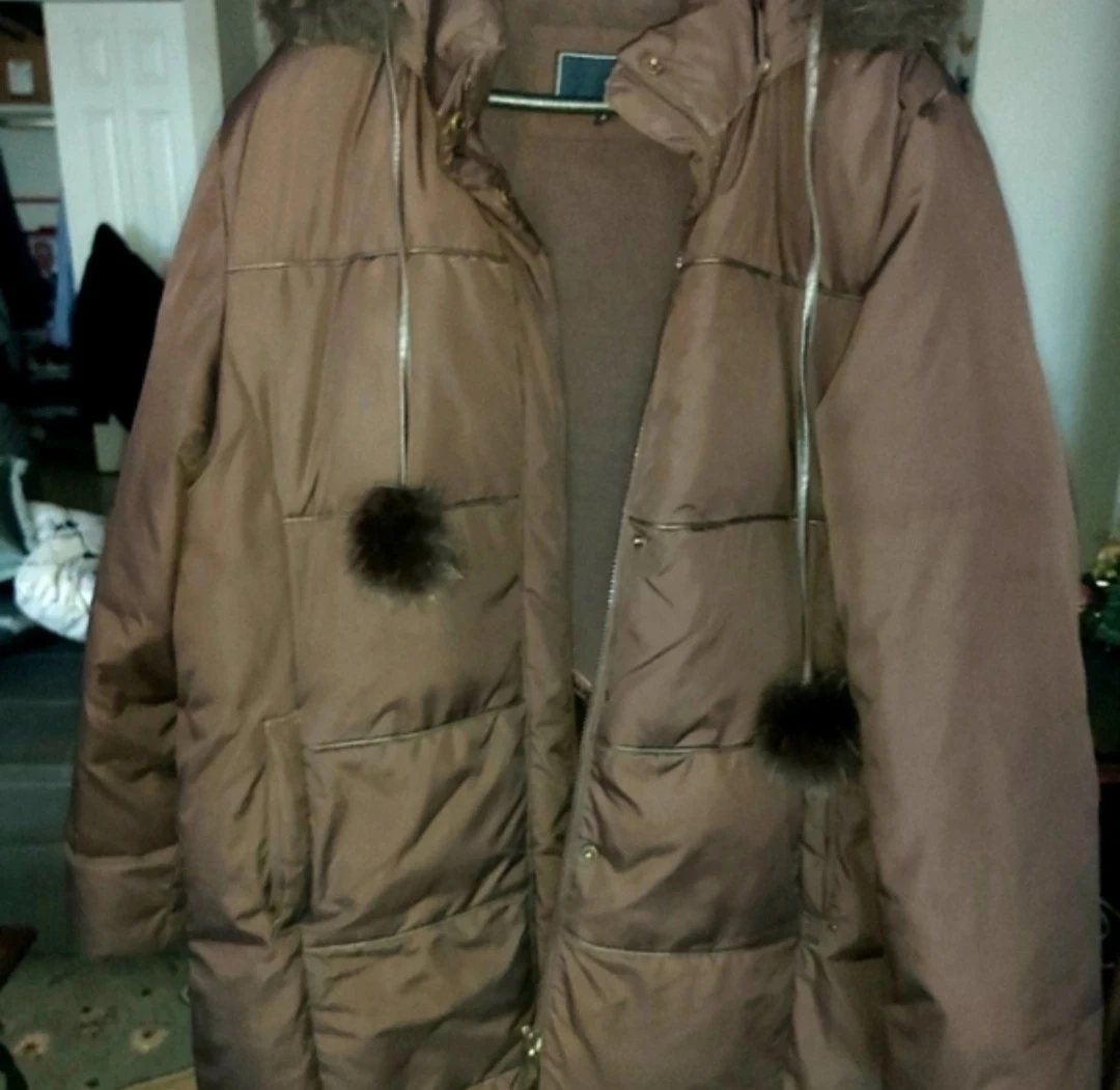 Here's a cozy brown puffer jacket, perfect for staying warm this winter! It has a fur trim around the hood and cute pom-pom details on the drawstrings. It looks like it's in good condition and ready for a new owner