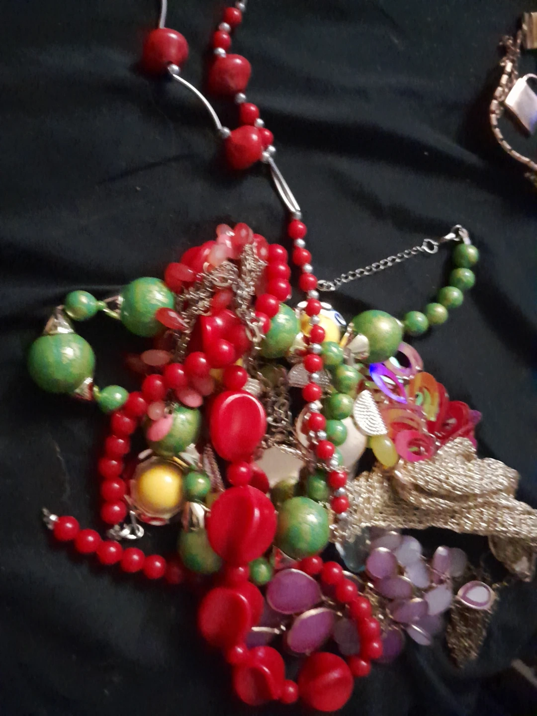 Selling a mixed lot of costume jewellery. Includes beaded necklaces in red and green, chain necklaces, and other assorted pieces. Perfect for adding some fun to your outfits!