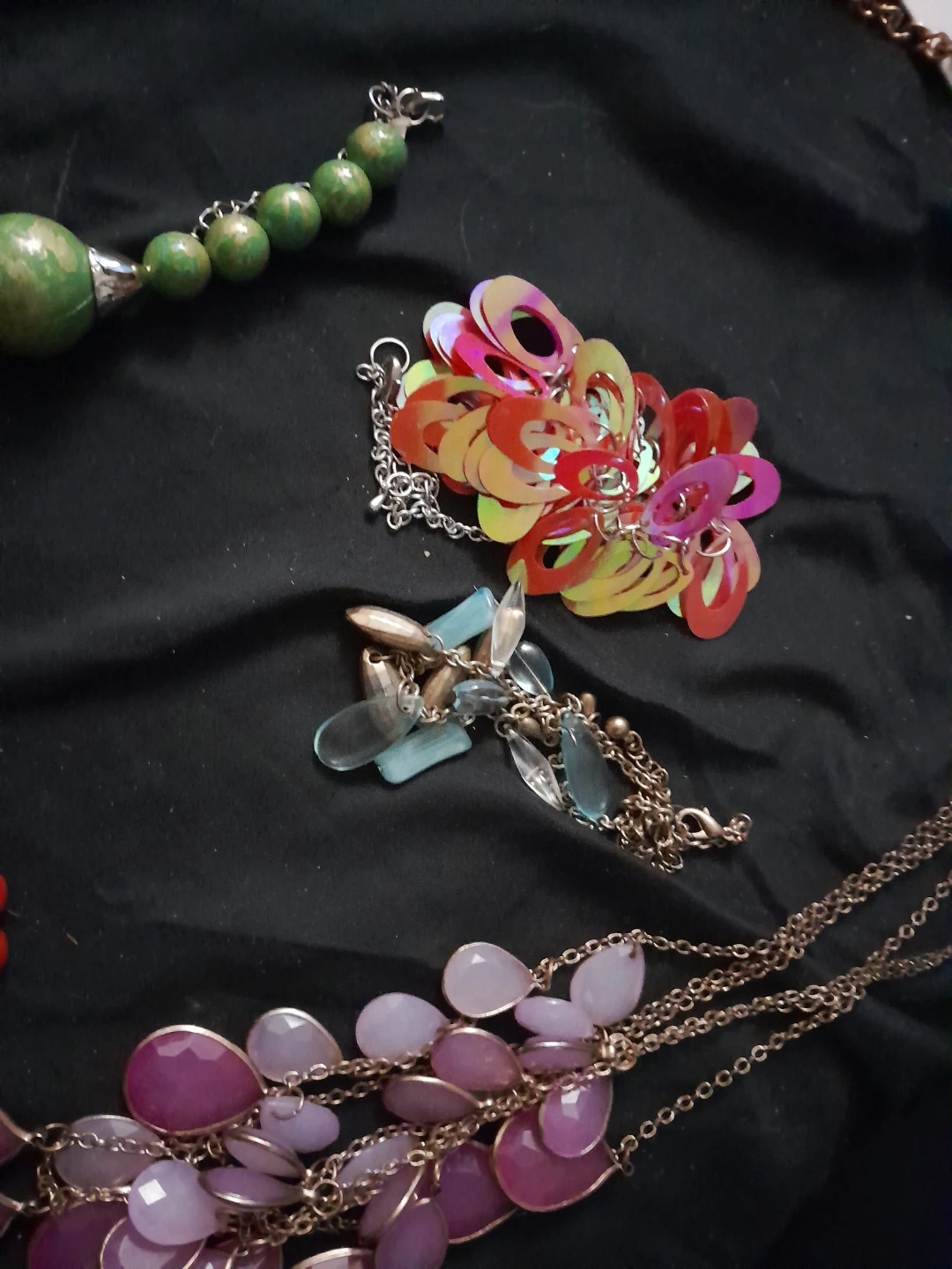 Selling a mixed lot of costume jewellery. Includes beaded necklaces in red and green, chain necklaces, and other assorted pieces. Perfect for adding some fun to your outfits!