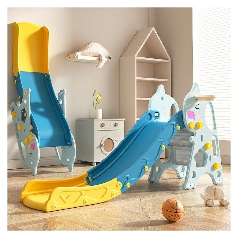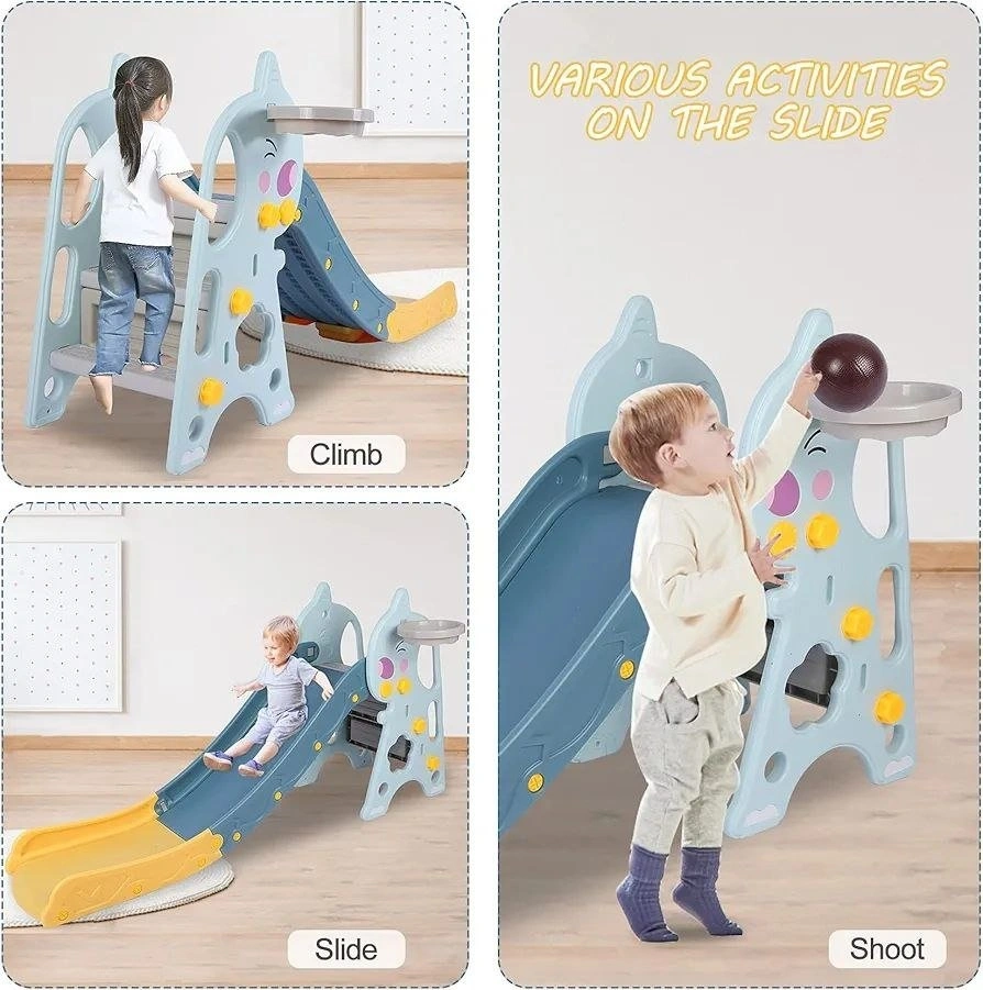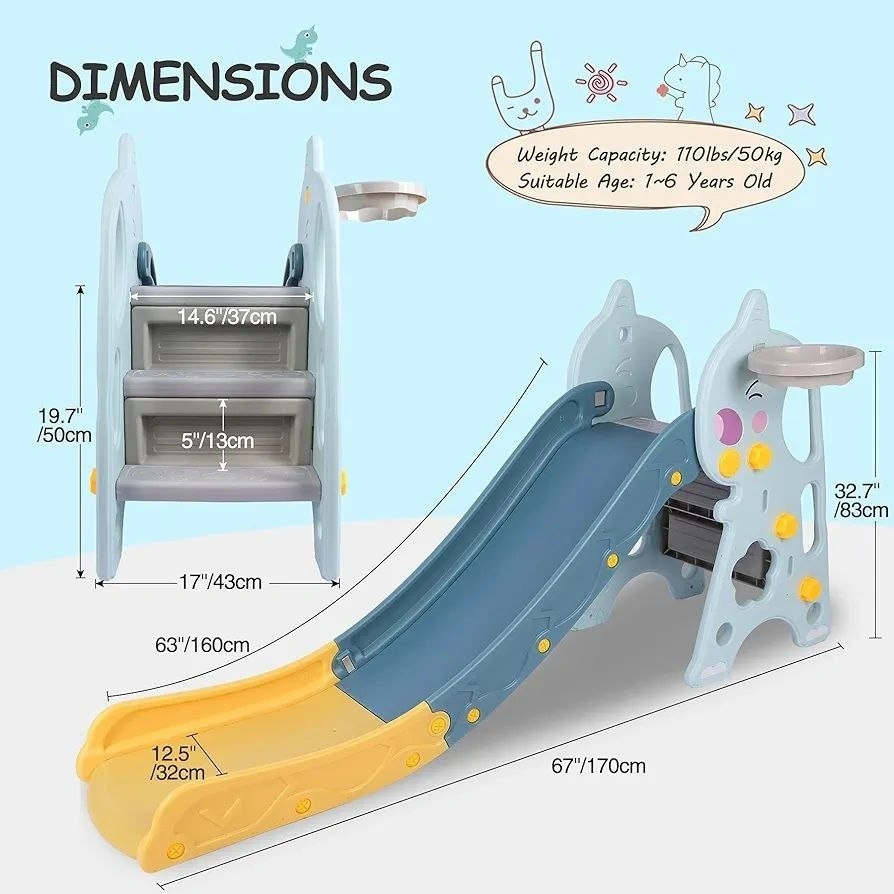 - 3-in-1 play set: climbing stairs, sliding, and basketball hoop