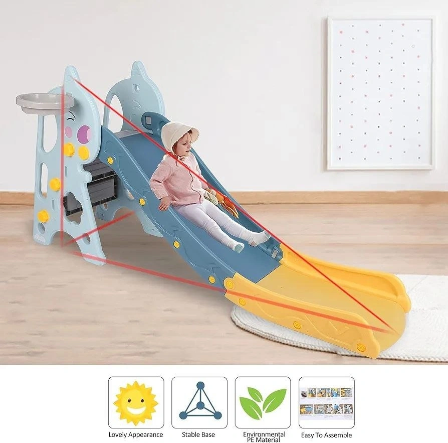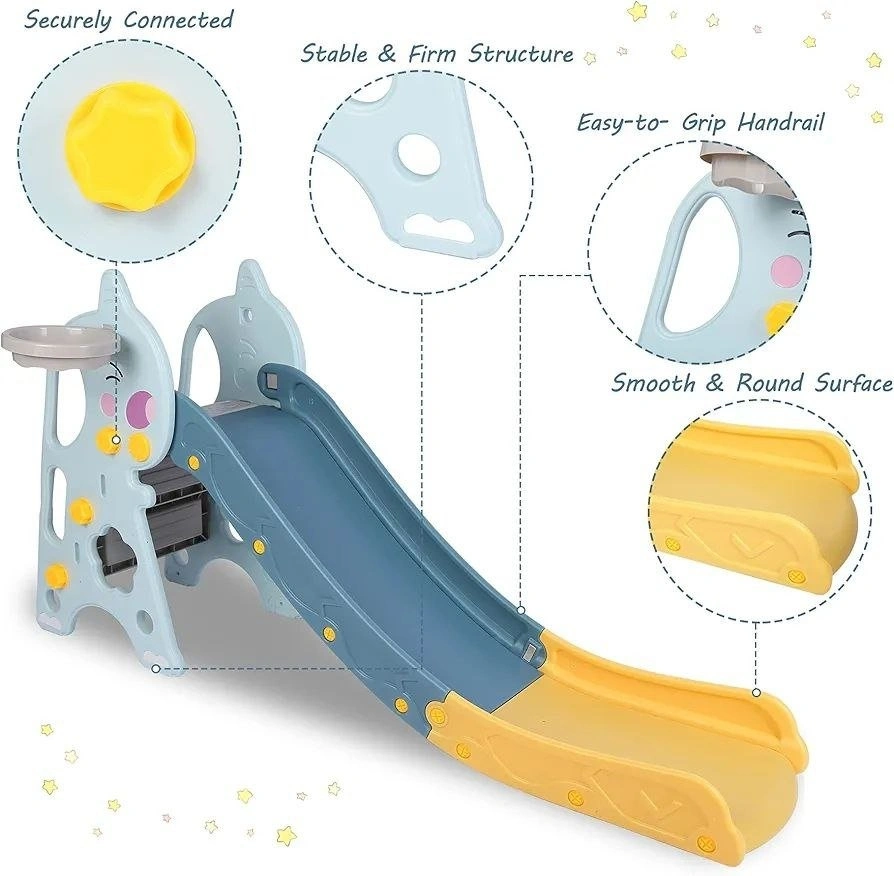- 3-in-1 play set: climbing stairs, sliding, and basketball hoop