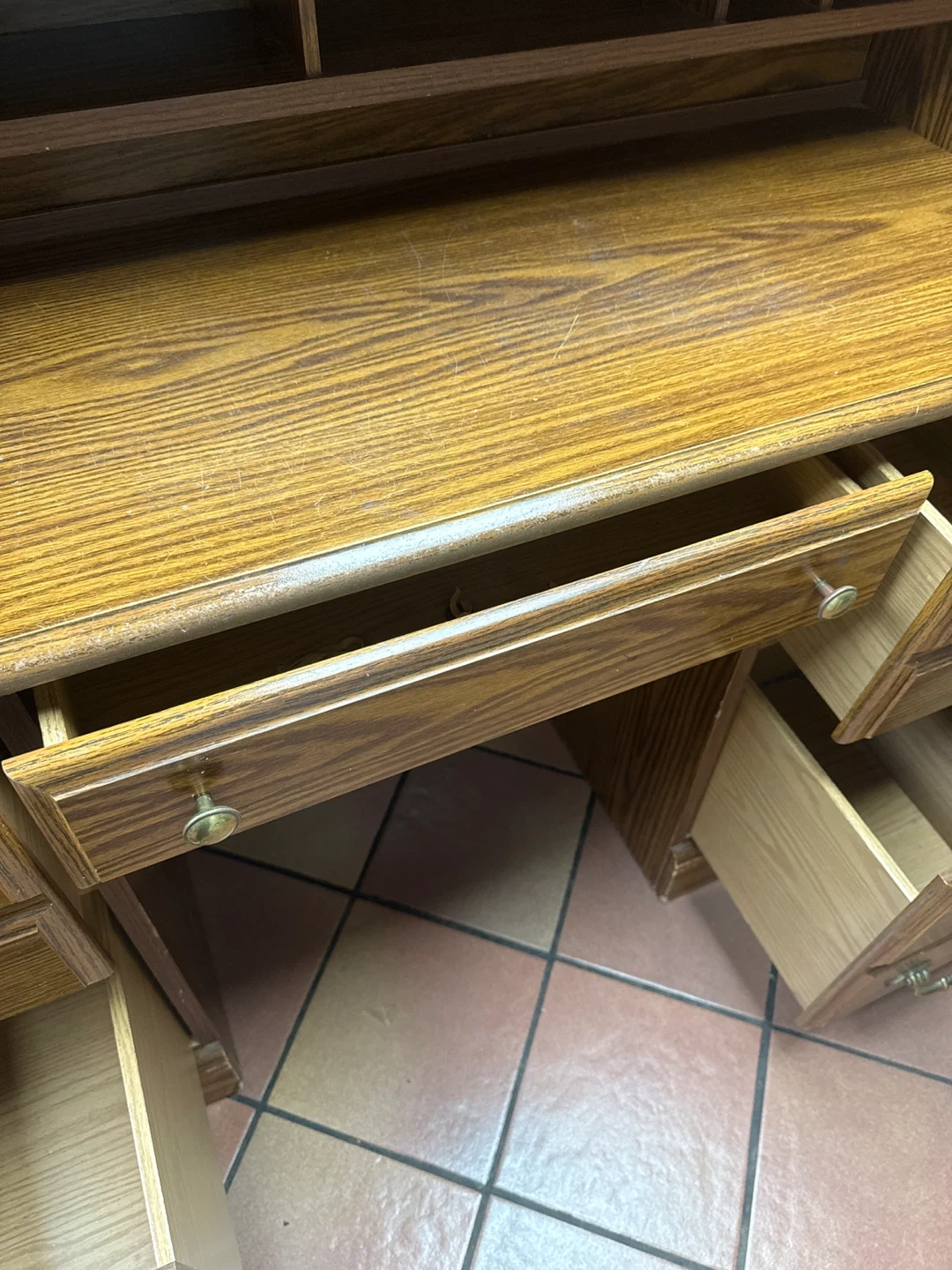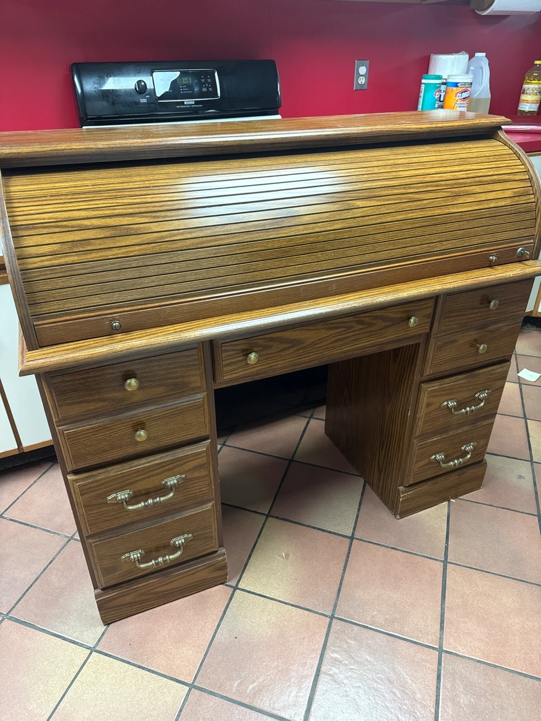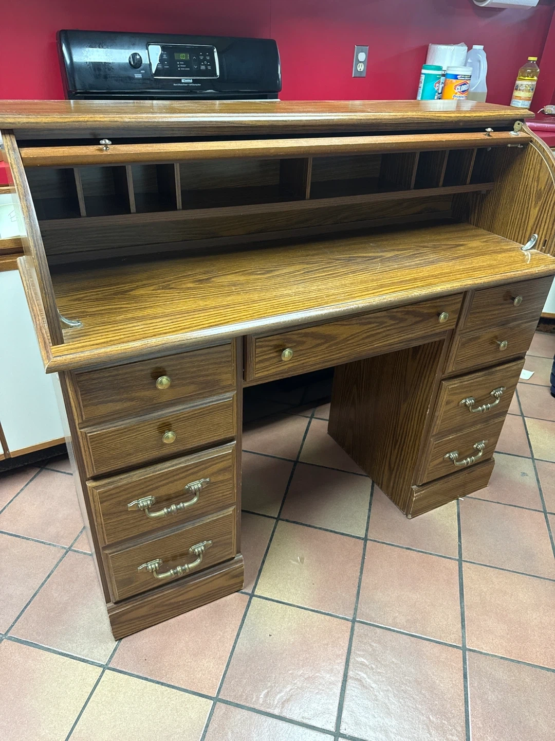 Selling a roll top wooden desk. It features multiple drawers for storage and a unique roll top design. Perfect for a home office or study space!