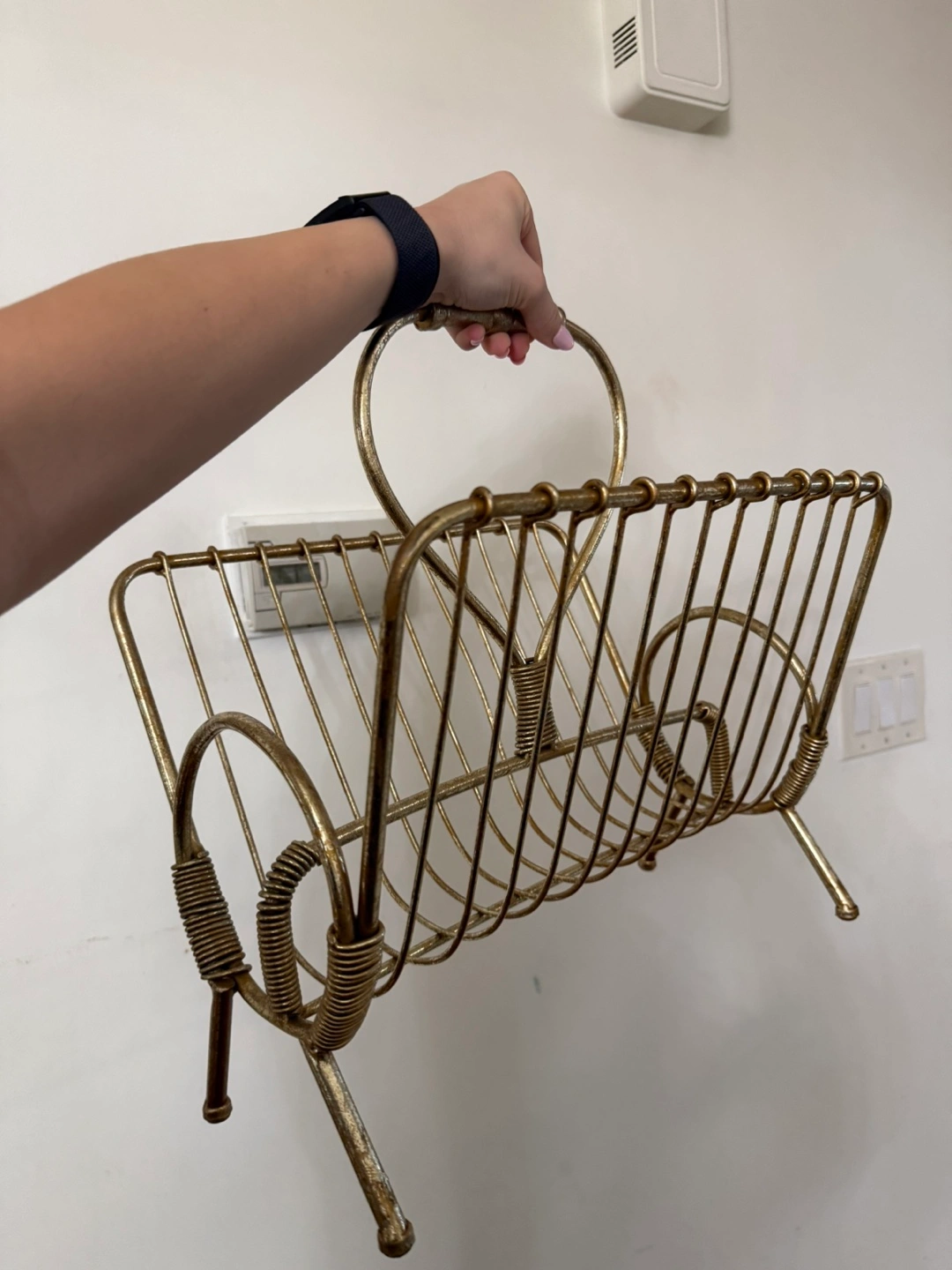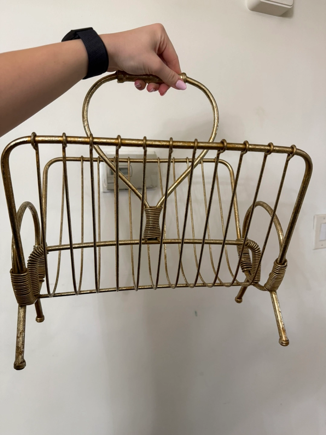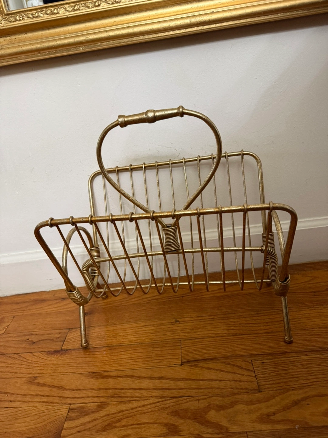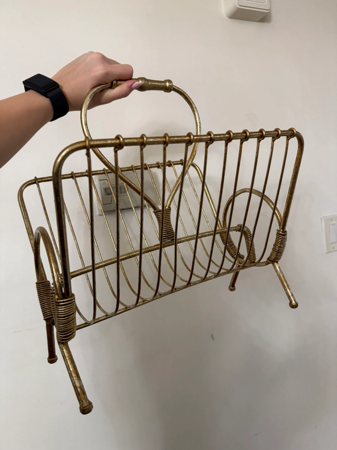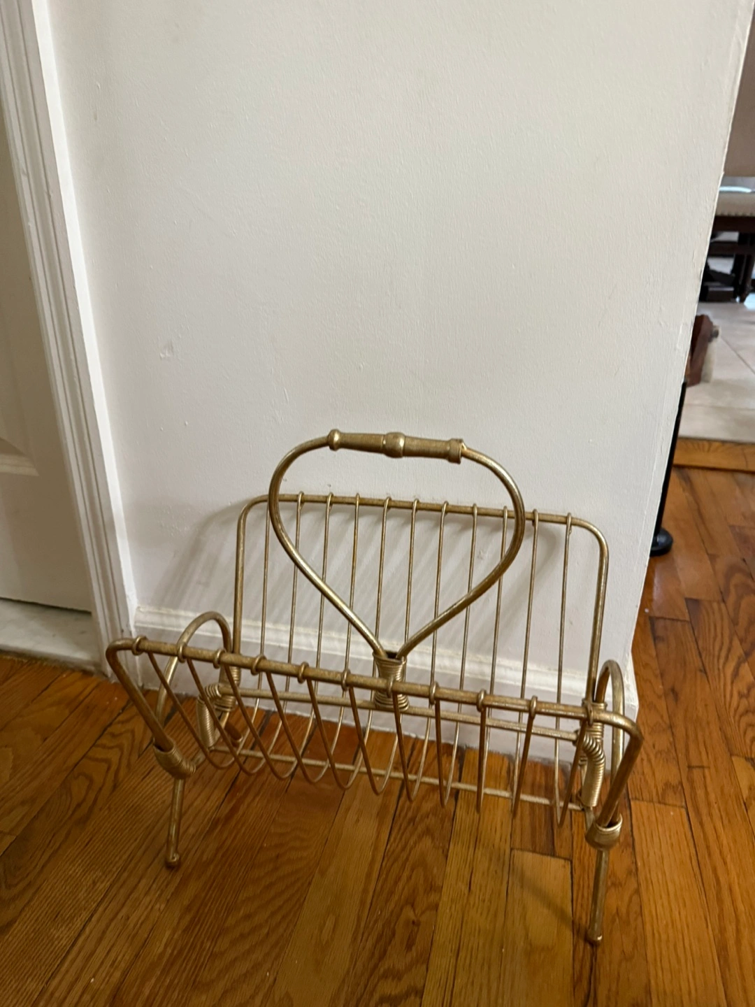 Selling a vintage gold metal magazine rack. It's a unique piece that adds a touch of retro charm to any room. Perfect for storing magazines, books, or even vinyl records!