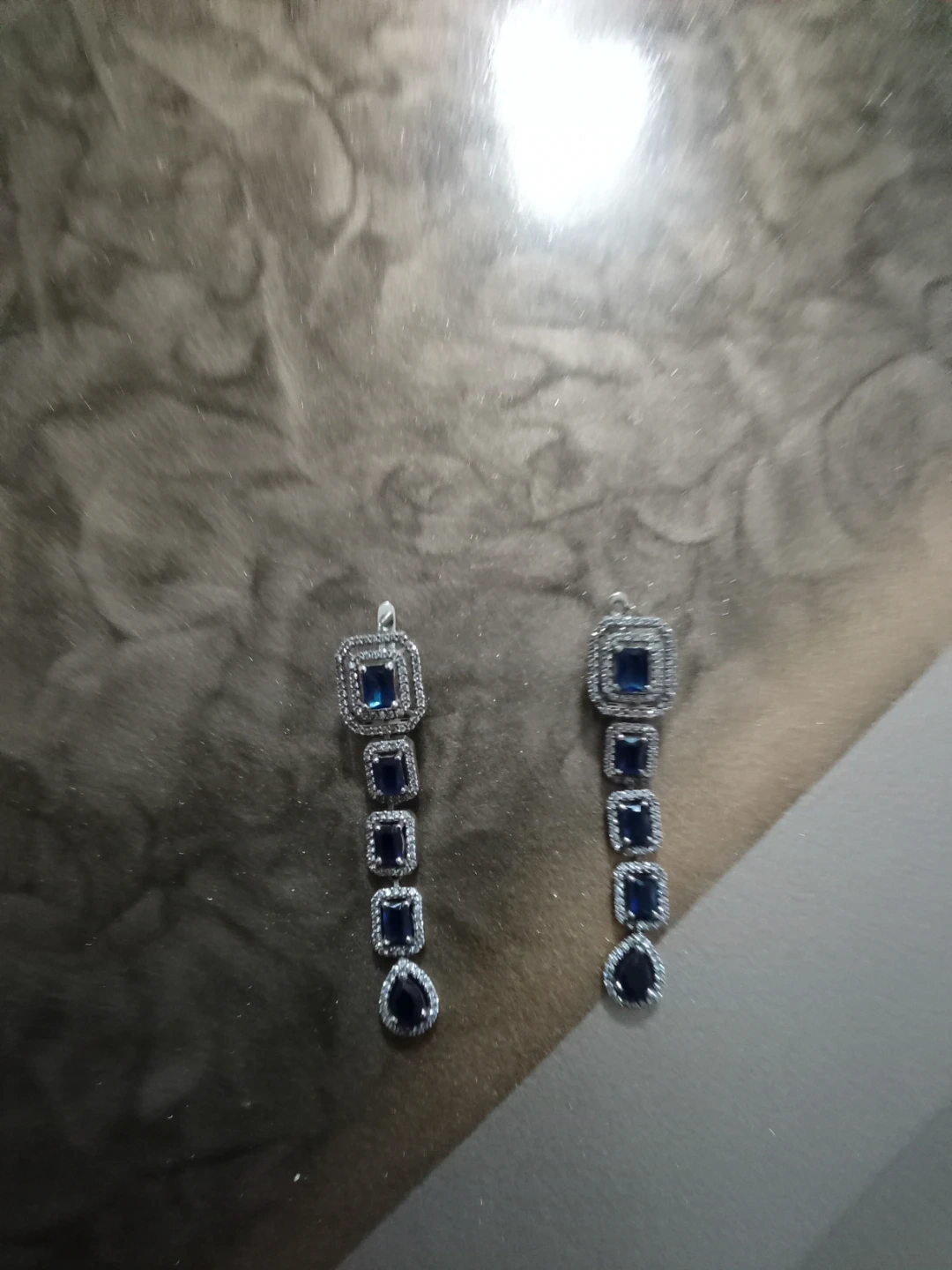 Selling a beautiful jewellery set that includes a necklace, bracelet, ring, and a pair of earrings. The set features elegant blue stones set in a silver-tone metal. Comes in a storage case. Pure silver