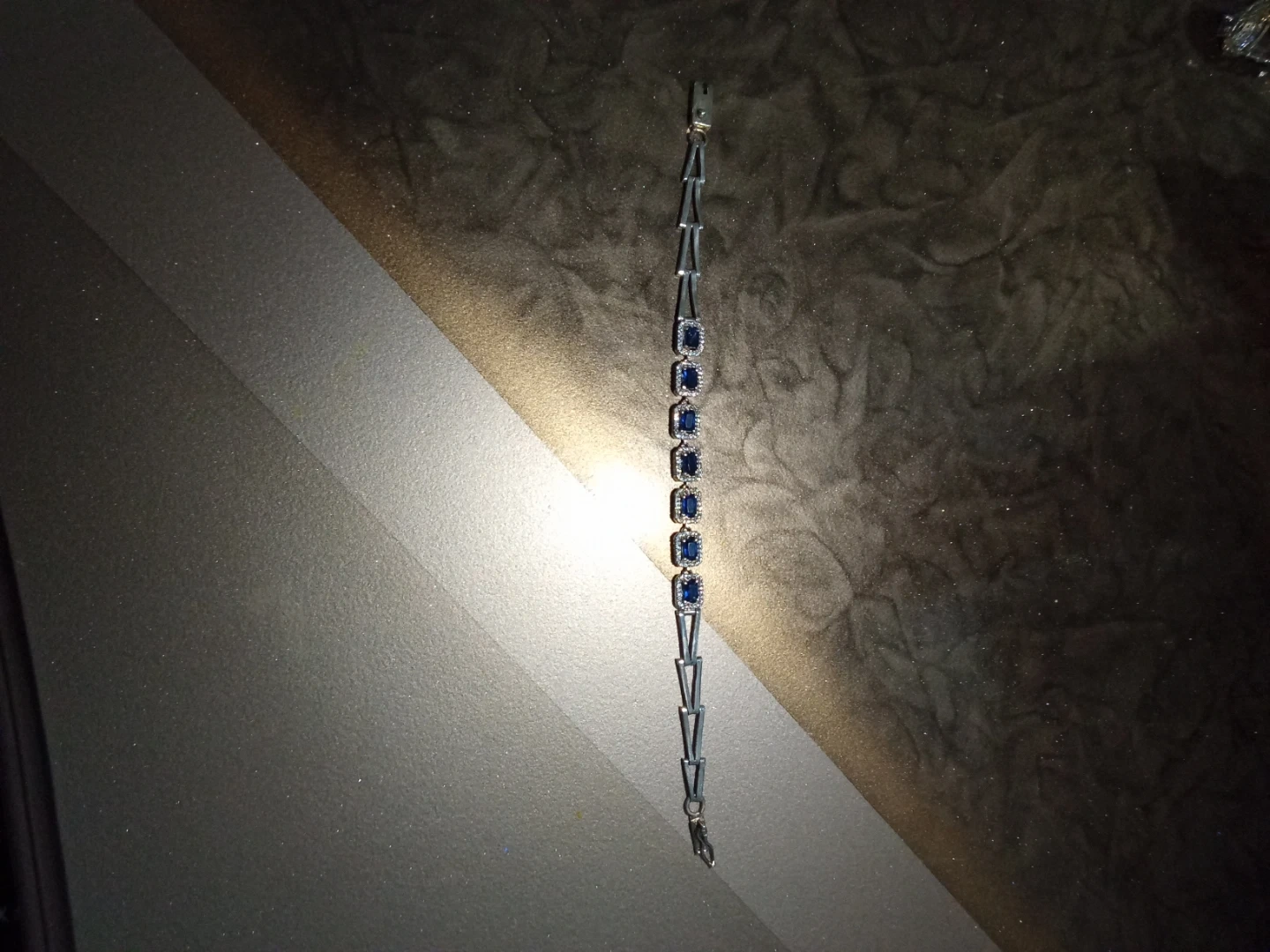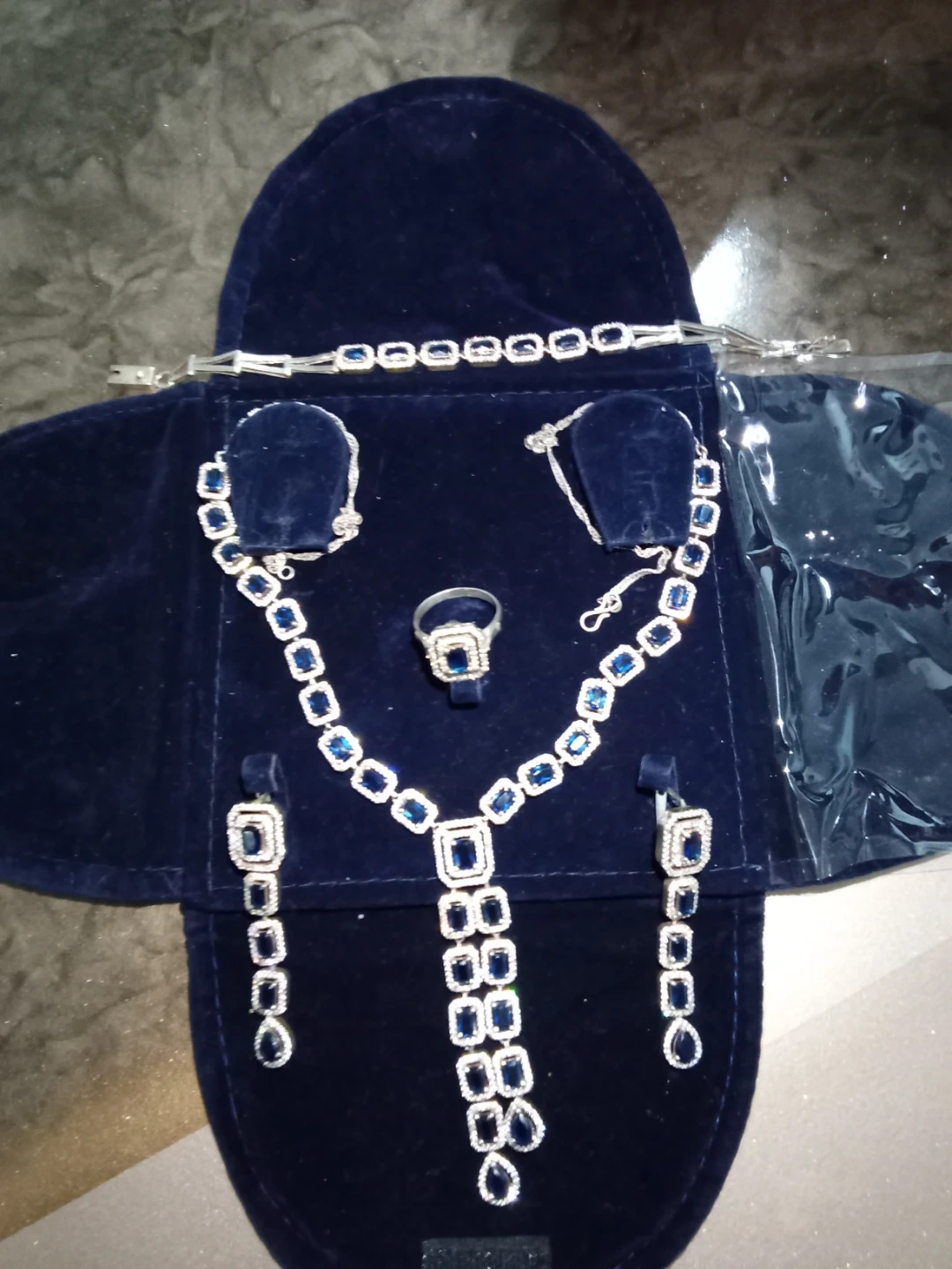 Selling a beautiful jewellery set that includes a necklace, bracelet, ring, and a pair of earrings. The set features elegant blue stones set in a silver-tone metal. Comes in a storage case. Pure silver