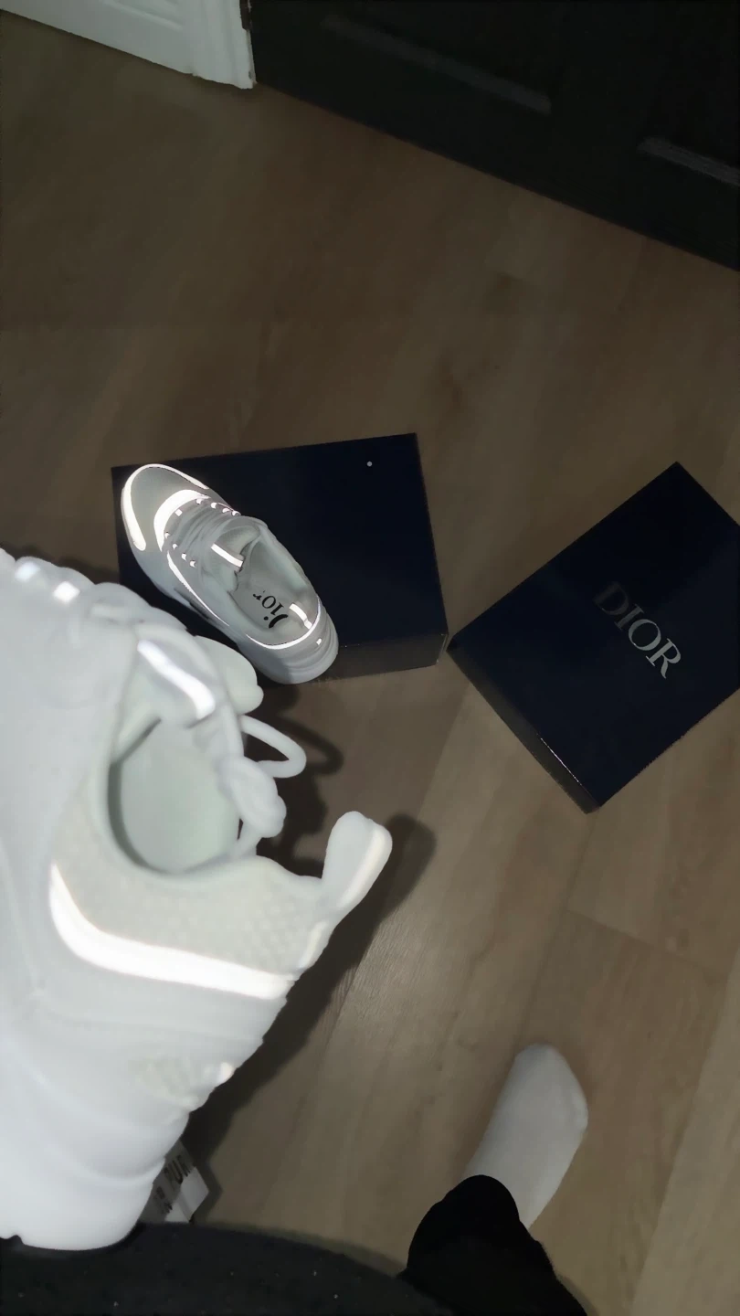 White Dior sneakers come with the original box. Features reflective detailing on the shoe. These trainers are a size medium. And its great quality Brad new if you want more pictures please text me