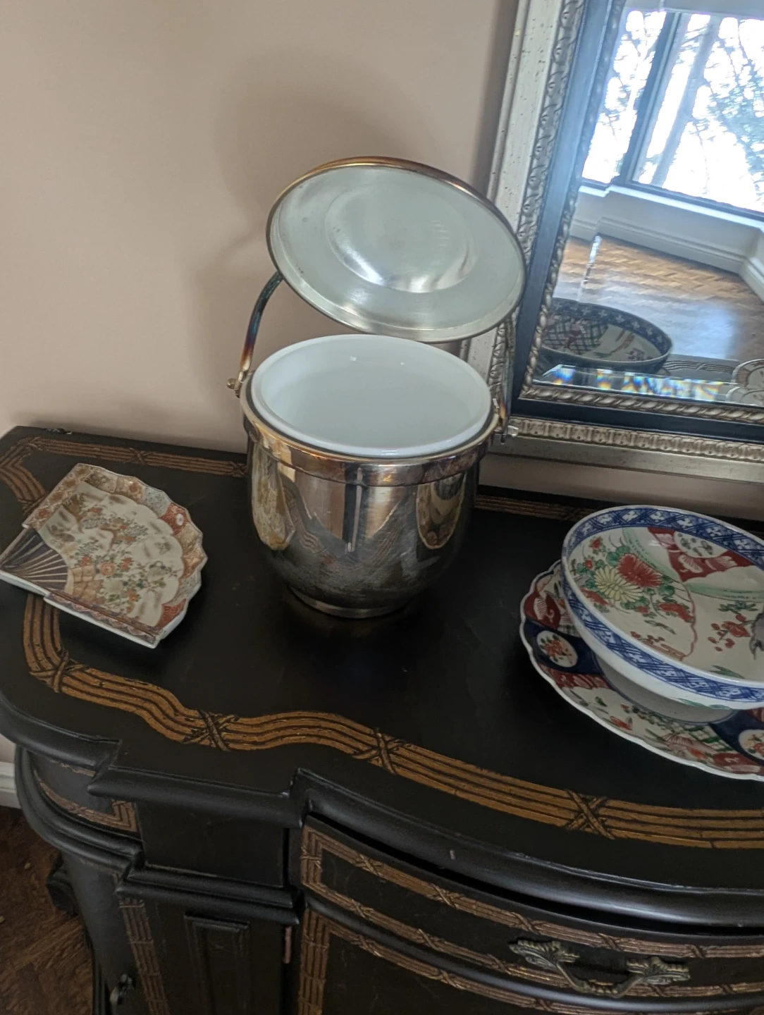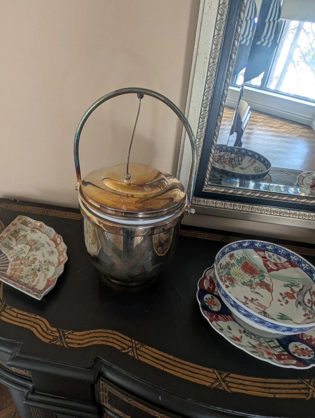 This is a stylish vintage ice bucket with a polished silver-tone finish. It features a convenient hinged lid and a sturdy handle for easy carrying. It's perfect for keeping drinks cool at gatherings.