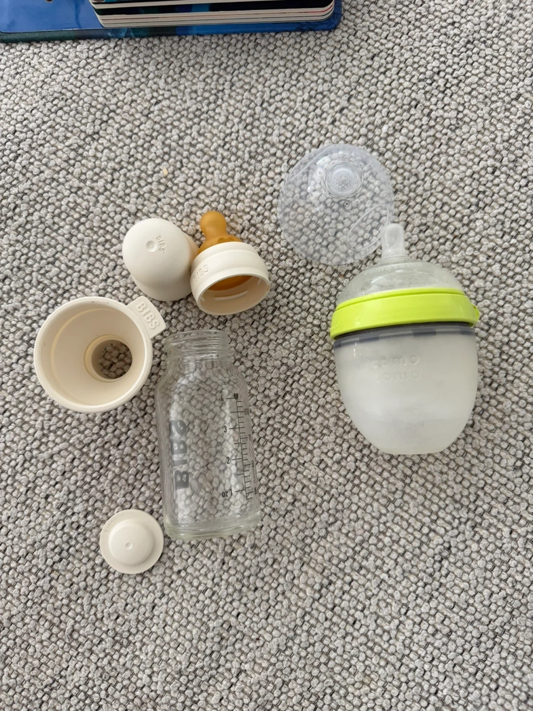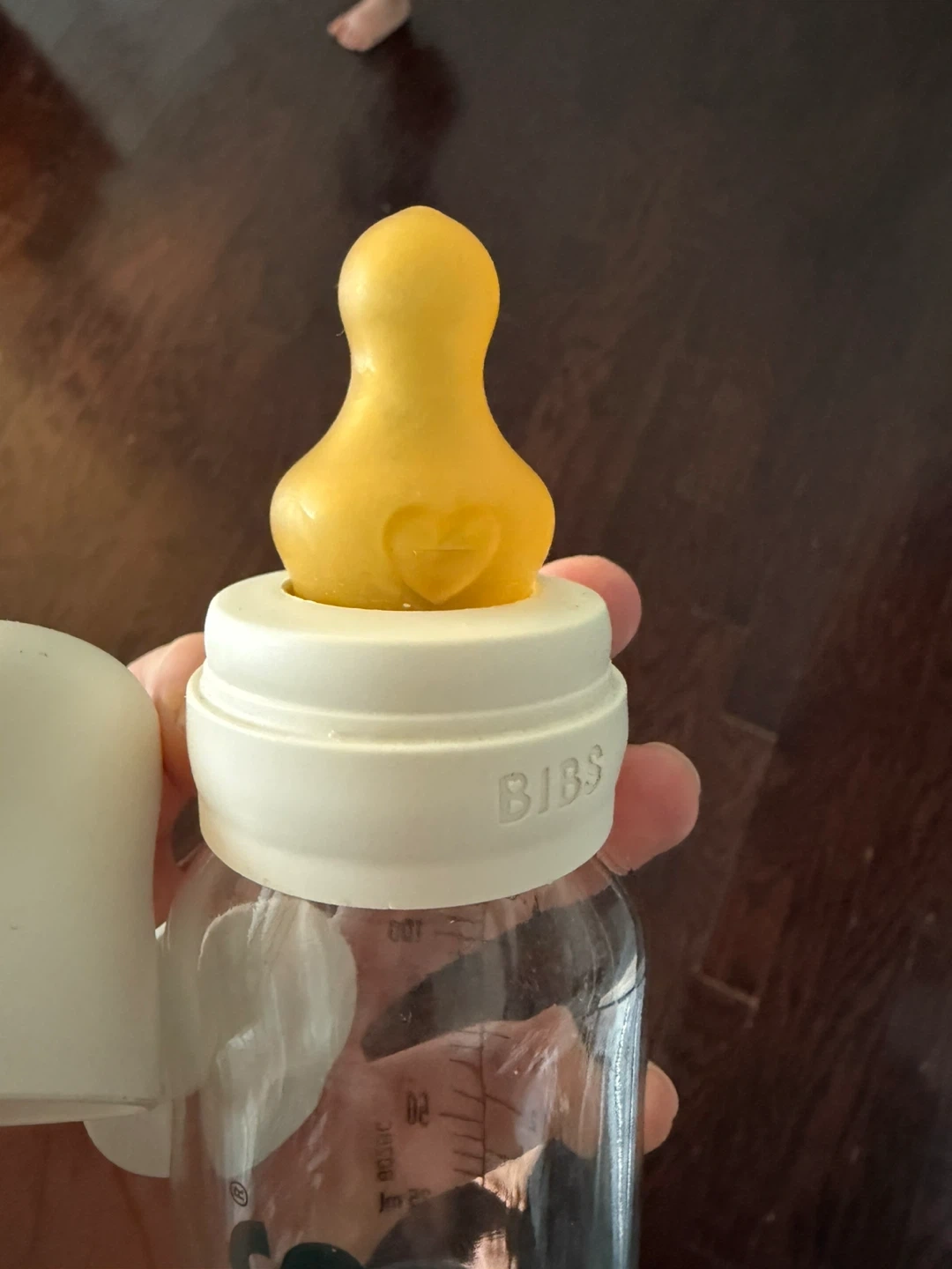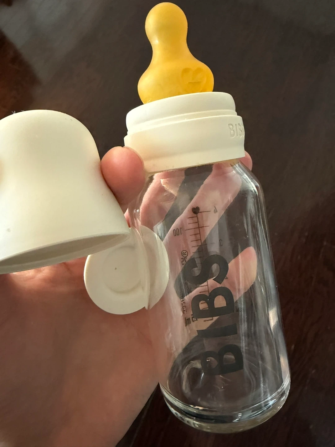 BIBS glass baby bottle with a yellow nipple. It's a 110ml bottle. Includes a protective cap and a separate funnel. +como como bottle