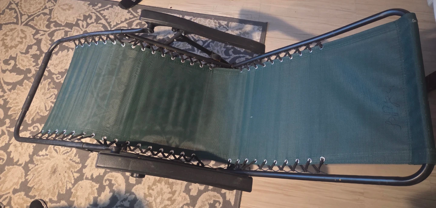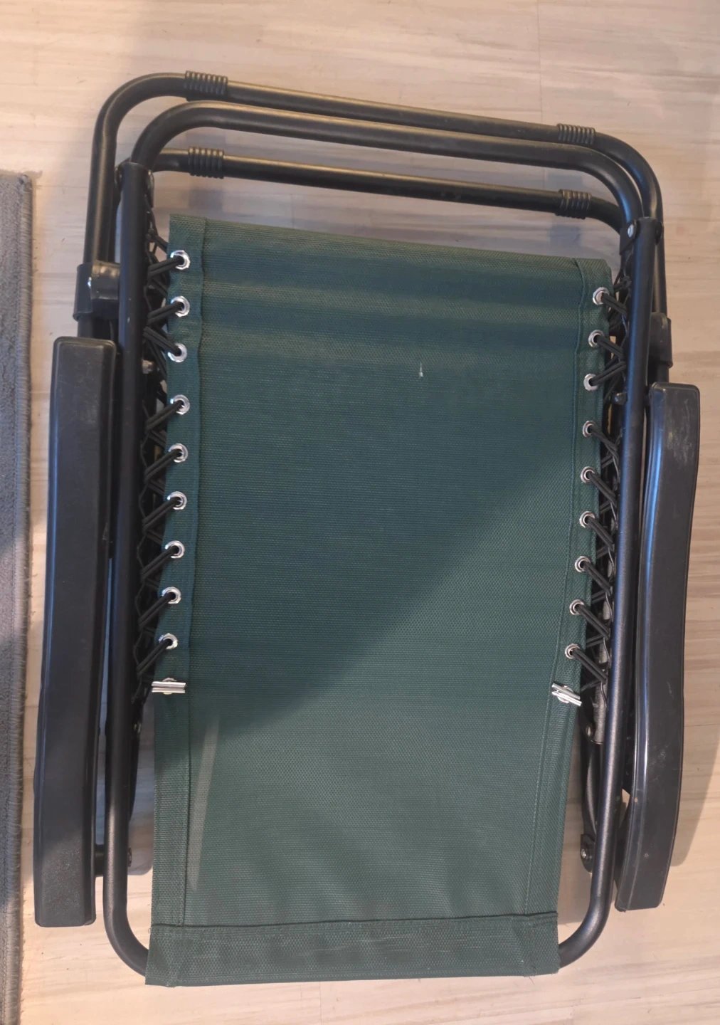This green zero gravity chair features a durable fabric seat and a black metal frame. It's designed for comfort and relaxation. The chair is foldable for easy storage. Great for patios or outdoor seating!