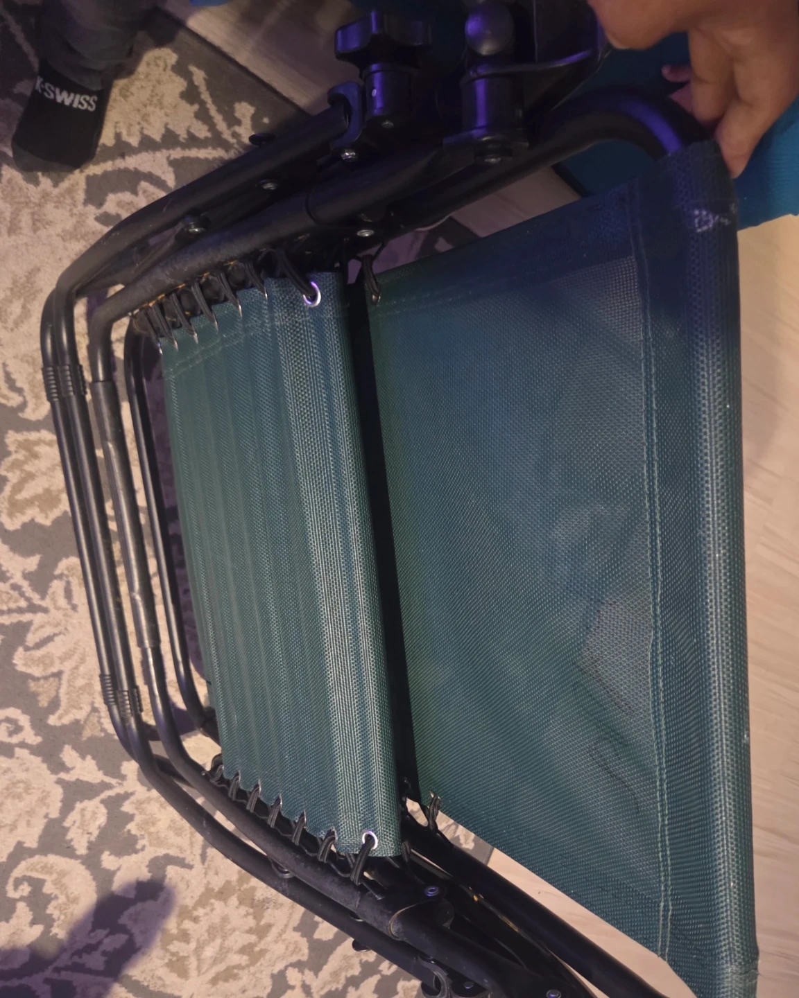 This green zero gravity chair features a durable fabric seat and a black metal frame. It's designed for comfort and relaxation. The chair is foldable for easy storage. Great for patios or outdoor seating!