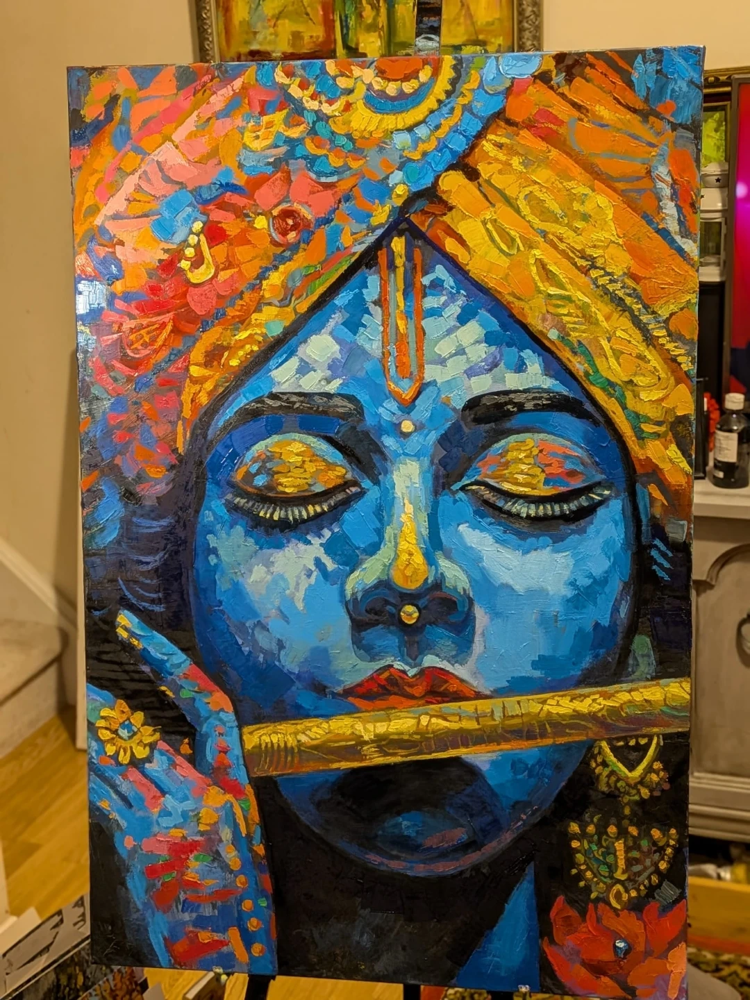 A vibrant, textured painting depicting Lord Krishna playing his flute. This artwork uses bold blue tones for the face and bright, contrasting colours for the ornate headwear and jewellery. Oil on canvas, ready to add a spiritual and artistic touch to any space. It's a striking piece that captures a devotional moment.