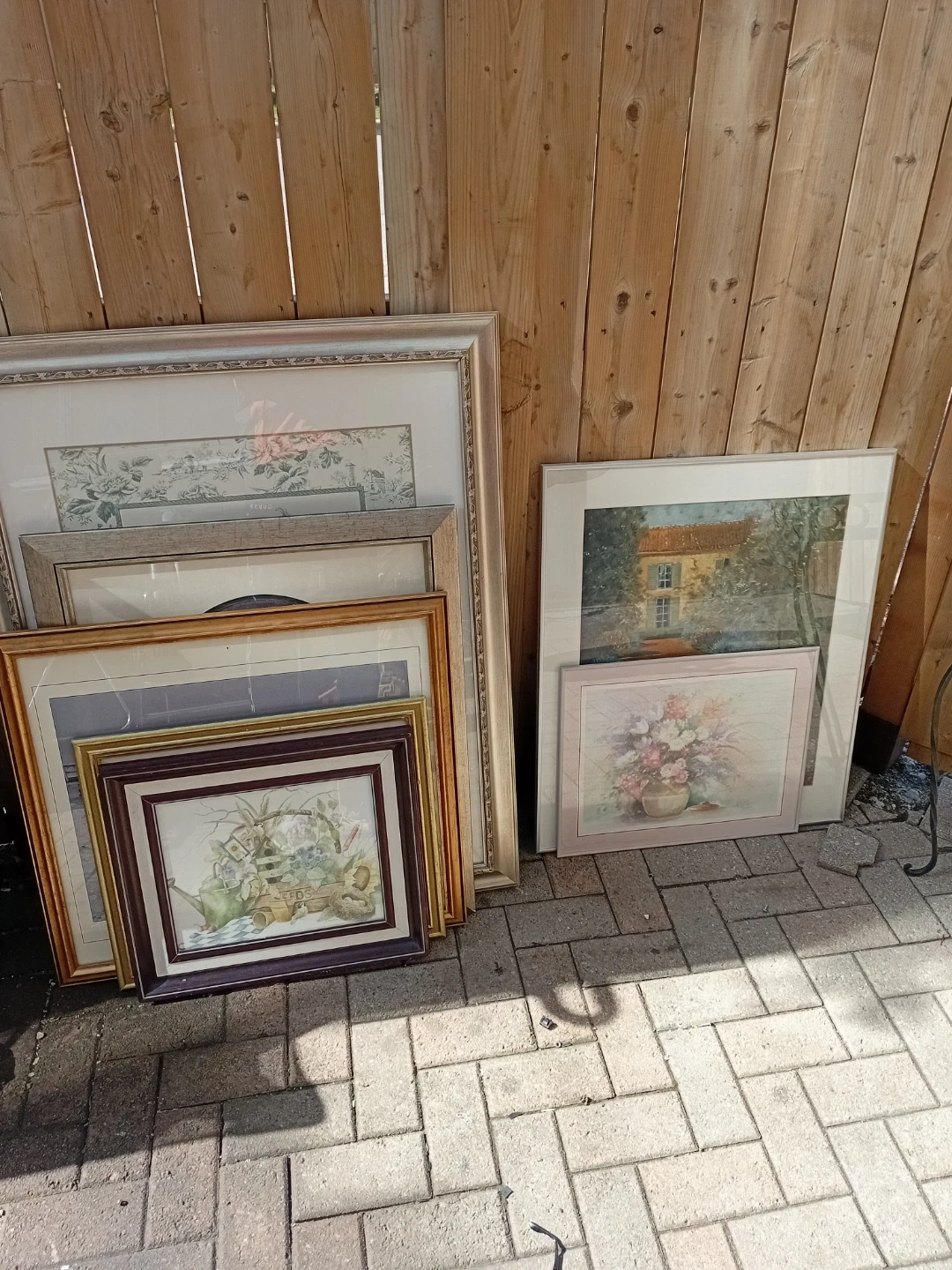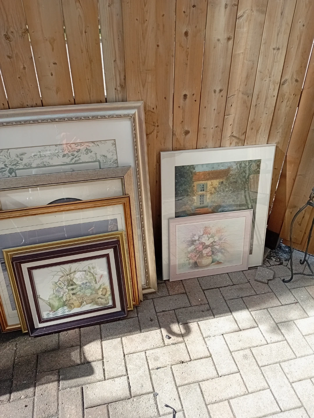 A collection of framed art prints, featuring landscape and floral motifs. Various frame styles and sizes are included. These pieces add a touch of decor to any living space. $50 for all of them
